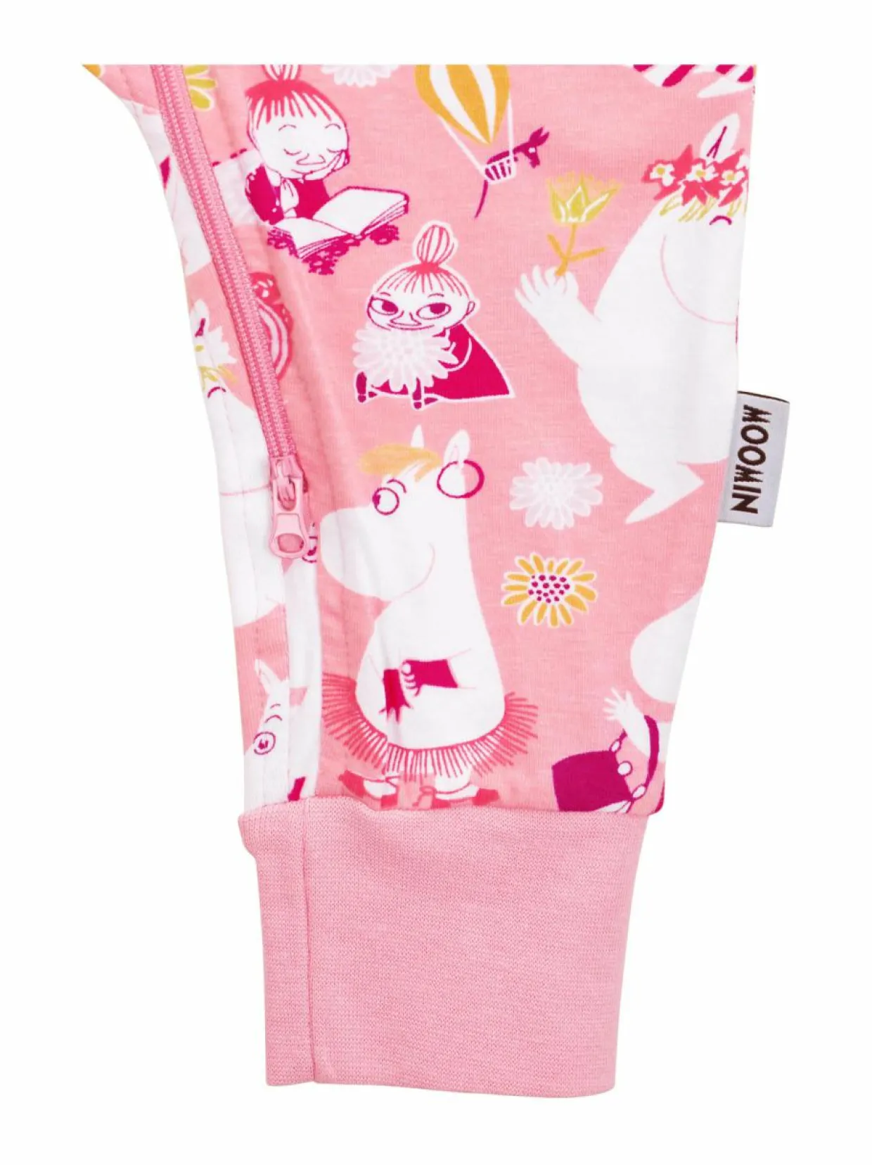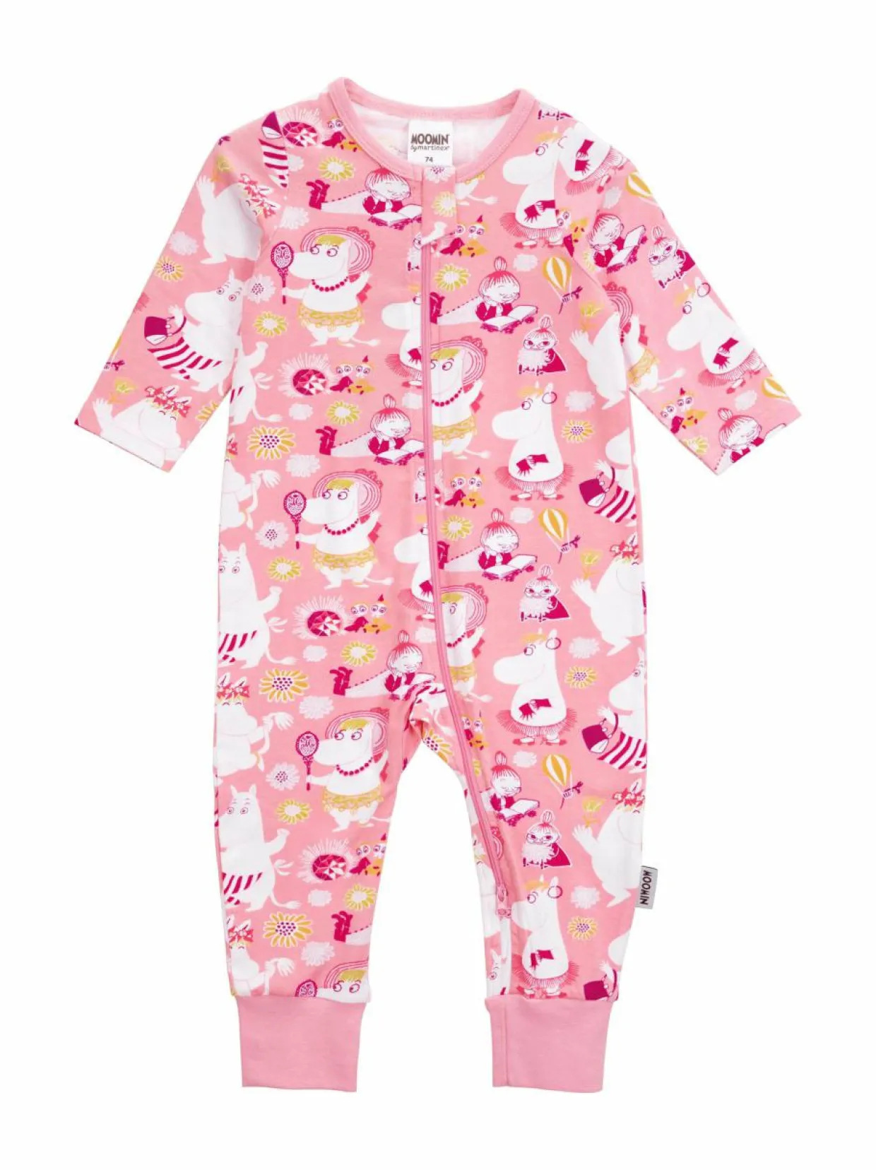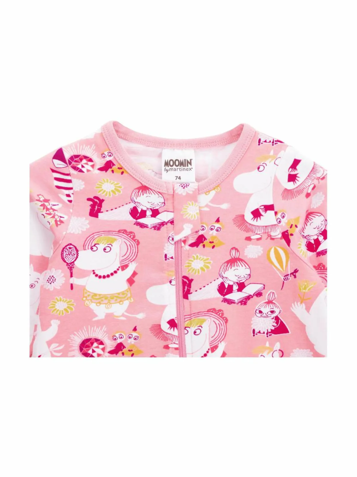 Pehmeä Muumi-pyjama Tamineet-kuosissa perheen pienimmille. Tässä yöpuvussa on pitkät hihat ja pitkä vetoketju vaivatonta vaipanvaihtoa varten. Materiaalina on käytetty luomupuuvillatrikoota.