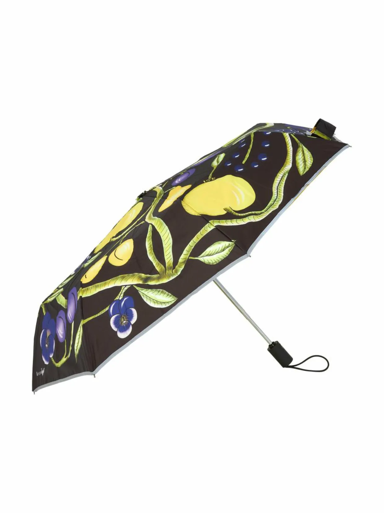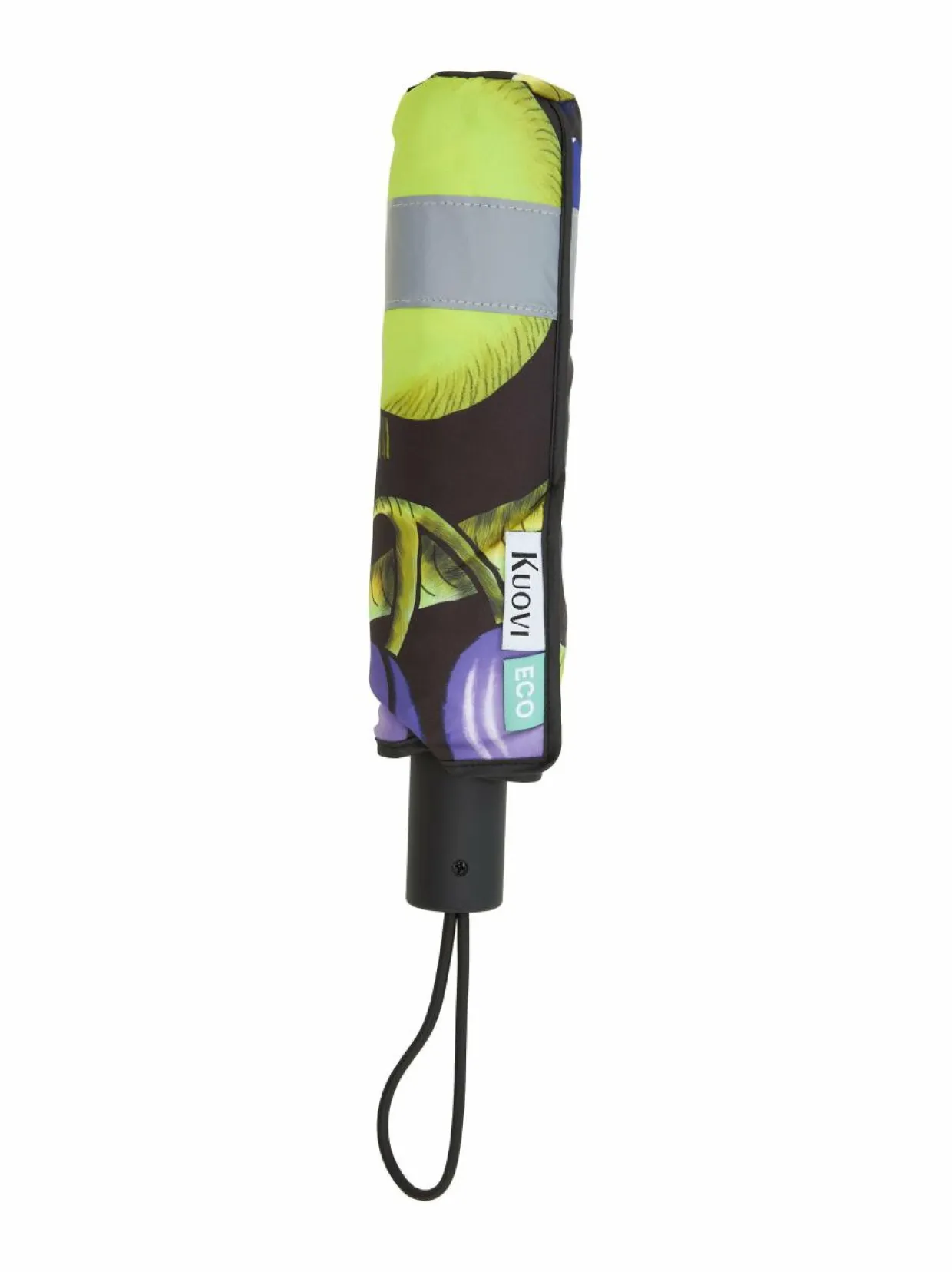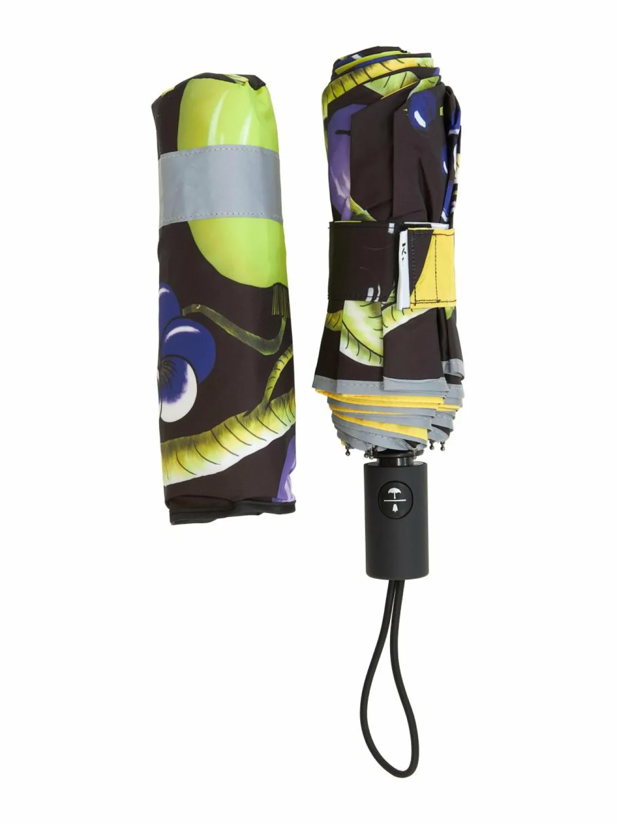 Täysautomaattinen sateenvarjo avautuu ja sulkeutuu nappia painamalla. Varjon reunaa pitkin kulkee heijastinnauha. Mukana tulee tarranauhalla sulkeutuva säilytyspussi. Kumipinnoitteisessa kahvassa on kätevä rannelenkki. Sateenvarjon pituus kokoon taitettuna on 27 cm ja halkaisija 95 cm.