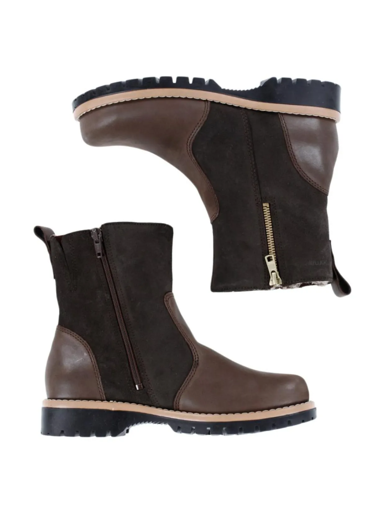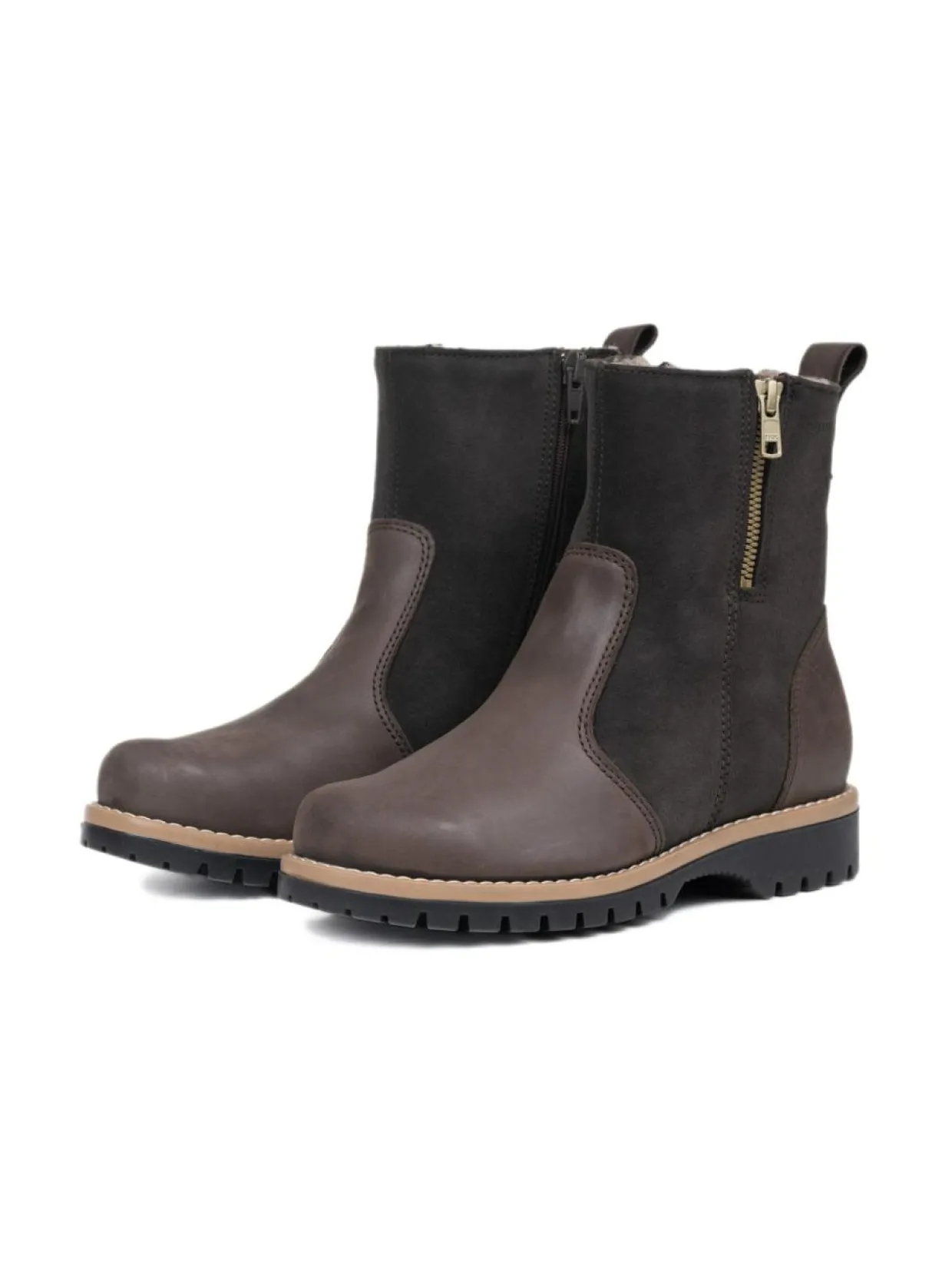 Päällismateriaali ruskeaa mokkanahkaa sekä pull-up-nahkaa, tehtaamme Zero Waste -materiaalia