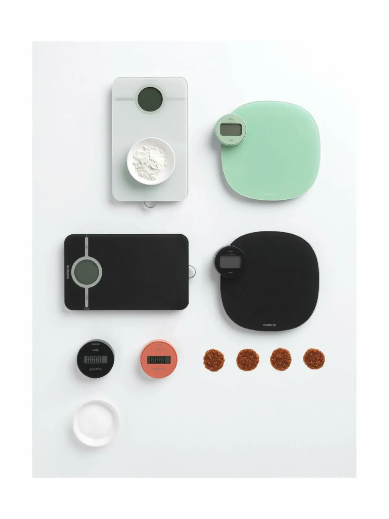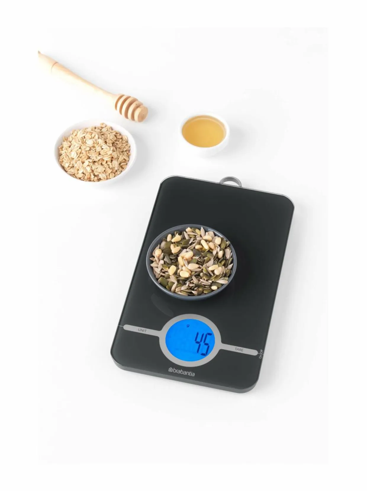 Brabantia Tasty+-keittiövaaka näyttää painon aina yhdestä grammasta viiteen kiloon saakka. Vaa’assa on lasipinta ja valaistu LCD-näyttö. Keittiövaaka on helppo ripustaa metallisen lenkin avulla. Mittaa eri mittayksiköissä – muunnoskytkin vaihtamiseksi arvoon g/oz/lb/ml.