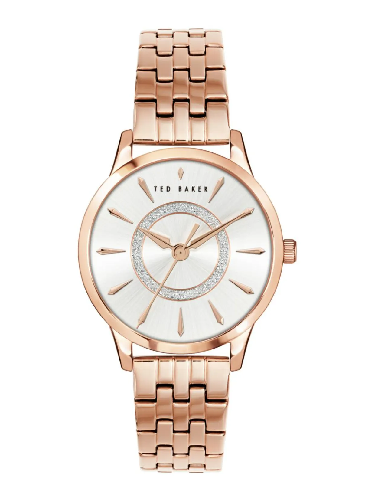 Ted Baker Analogue Classic 34mm rannekello sävähdyttää niin arjessa kuin juhlassa. Kellon ruusukullanvärinen runko on valmistettu ruostumattomasta teräksestä. Sen leveys on 34mm ja paksuus on 9mm. Tässä kellossa on ruusukullanvärinen mesh ranneke, joka on ruostumatonta terästä. Kellon hopeanvärisen taulun keskiosaa kiertää glitter ympyrä, joka elävöittää tyylikkään taulun. Kellossa on mineraalilasi ja kvartsikoneisto. Kellon vesitiiviys on 5ATM. Ted Baker kelloilla on 2 vuoden takuu.