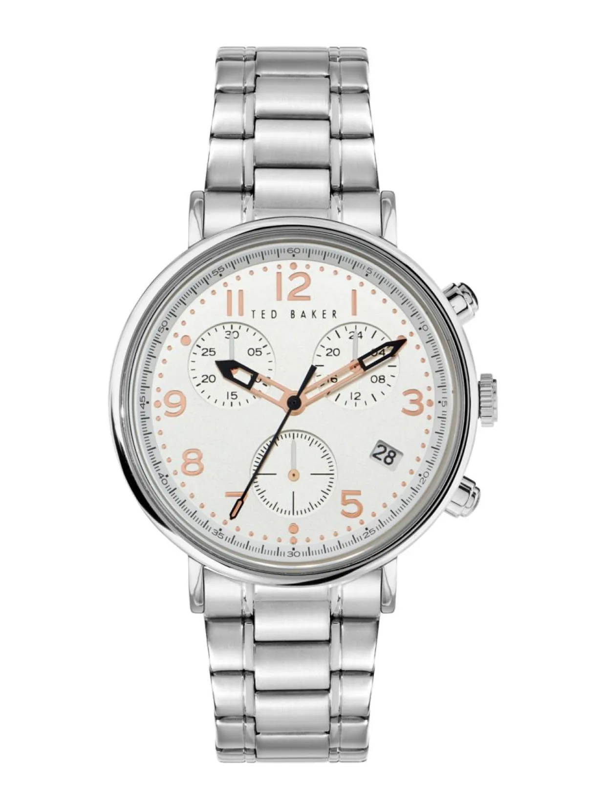 Ted Baker Crono Classic 41mm on ajaton ja selkeä. Kellon hopeanvärinen runko on valmistettu ruostumattomasta teräksestä. Sen leveys on 41mm ja paksuus on 10,96mm. Rannekkeena tässä mallissa on hopeanvärinen metalliranneke, joka on valmistettu ruostumattomasta teräksestä. Valkoisessa kellotaulussa on pienemmät näytöt ajanottoa varten. Kellossa on mineraalilasi ja kvartsikoneisto. Kellon vesitiiviys on 5ATM. Ted Baker kelloilla on 2 vuoden takuu.