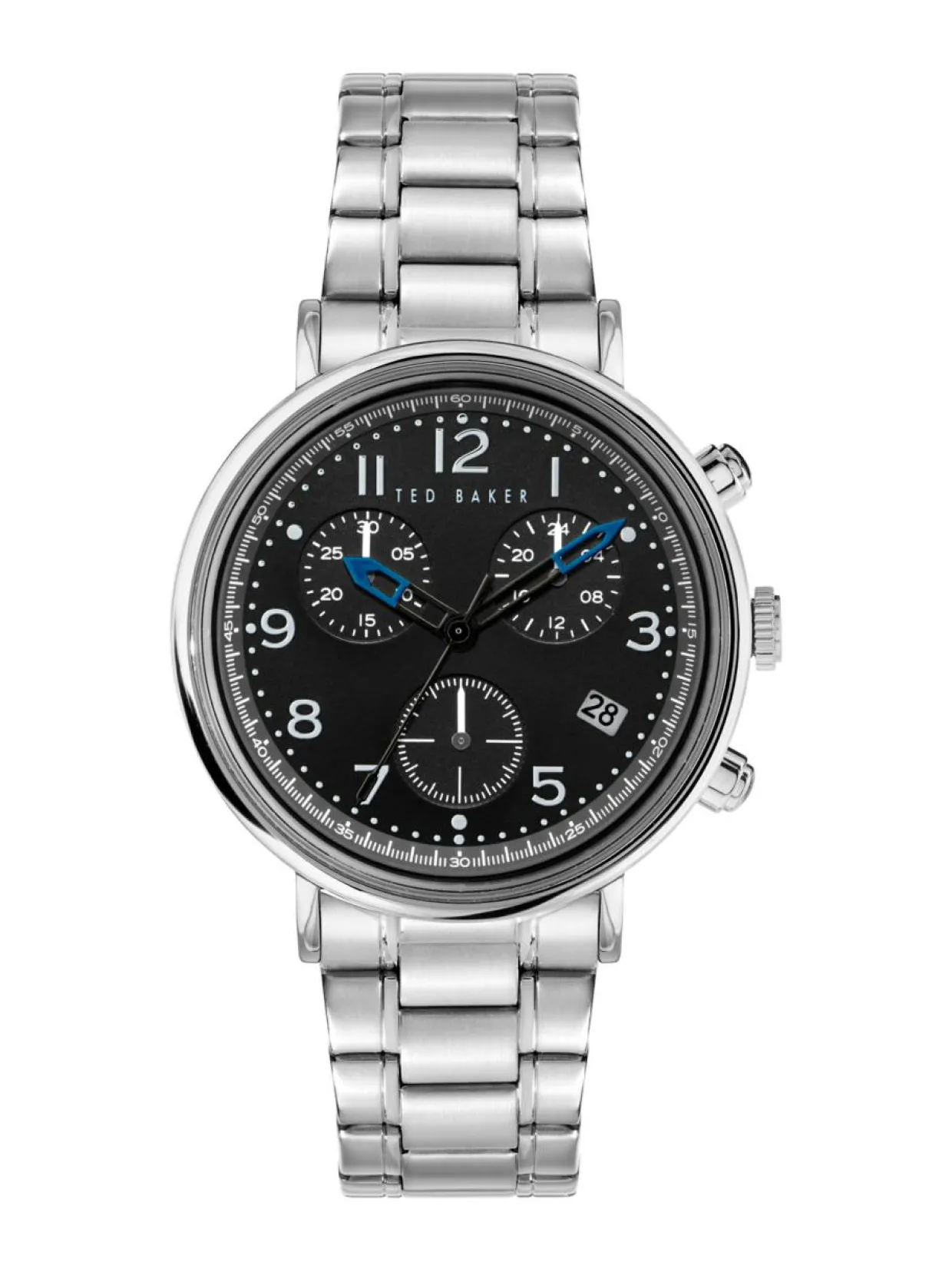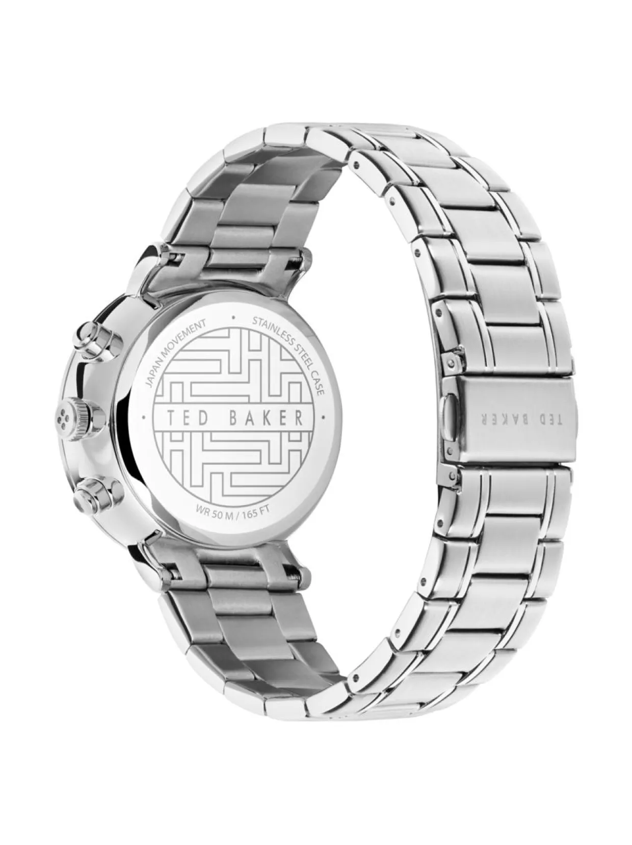 Ted Baker Crono Classic 41mm on ajaton ja selkeä. Kellon hopeanvärinen runko on valmistettu ruostumattomasta teräksestä. Sen leveys on 41mm ja paksuus on 10,96mm. Rannekkeena tässä mallissa on hopeanvärinen metalliranneke, joka on valmistettu ruostumattomasta teräksestä. Mustassa kellotaulussa on pienemmät näytöt ajanottoa varten. Kellossa on mineraalilasi ja kvartsikoneisto. Kellon vesitiiviys on 5ATM. Ted Baker kelloilla on 2 vuoden takuu.