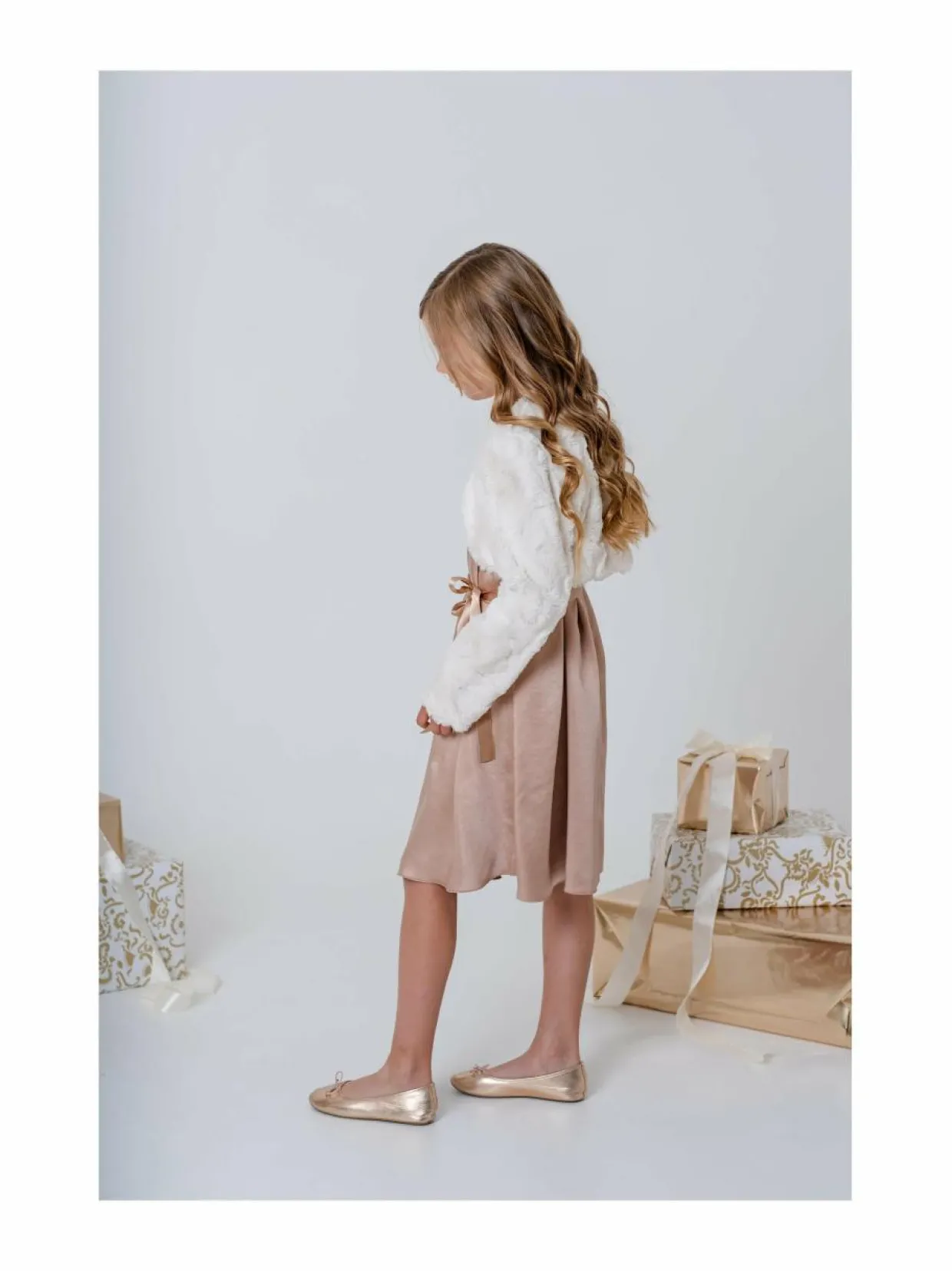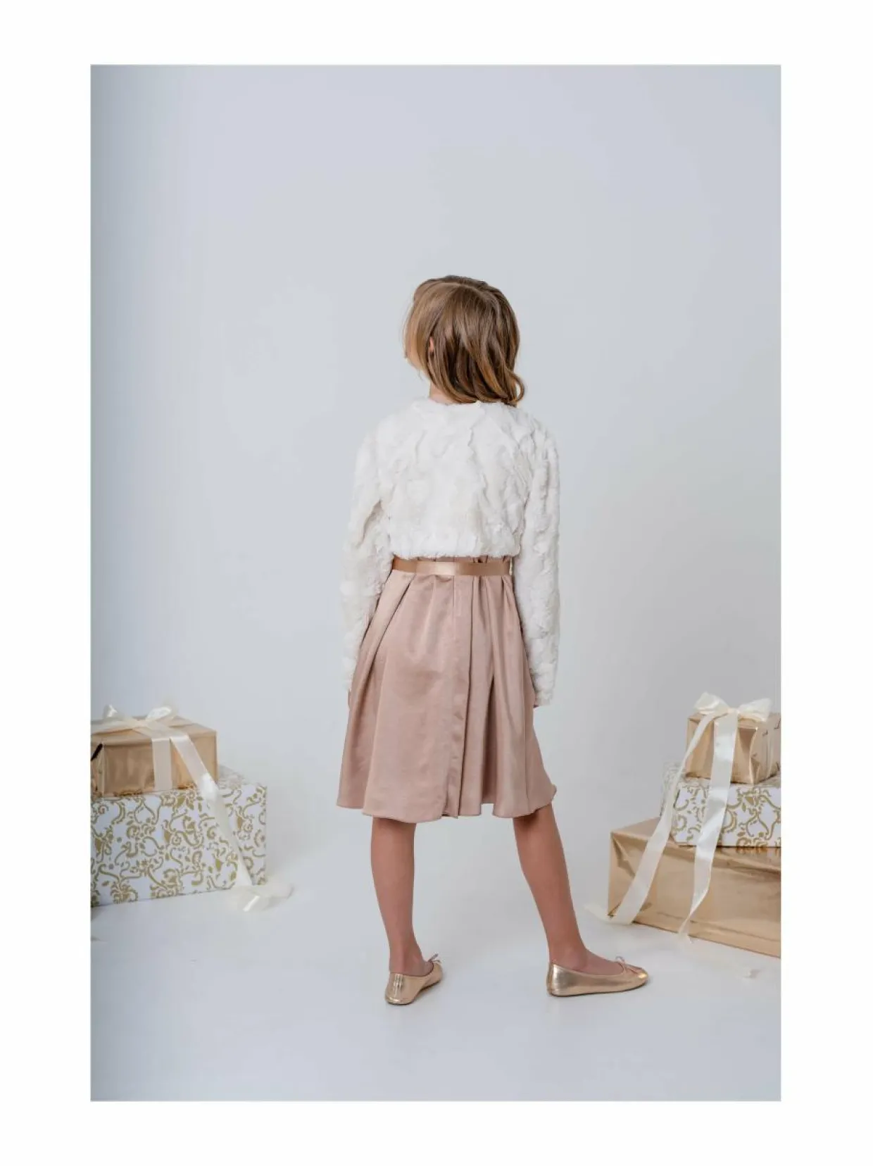 Lyhythelmainen Mignelin-bolero on valmistettu ihanan pörröisen pehmeästä tekoturkiksesta. Vuori on sileäpintaista kangasta. Tekoturkisbolero viimeistelee lapsen juhlaasun ihastuttavasti.