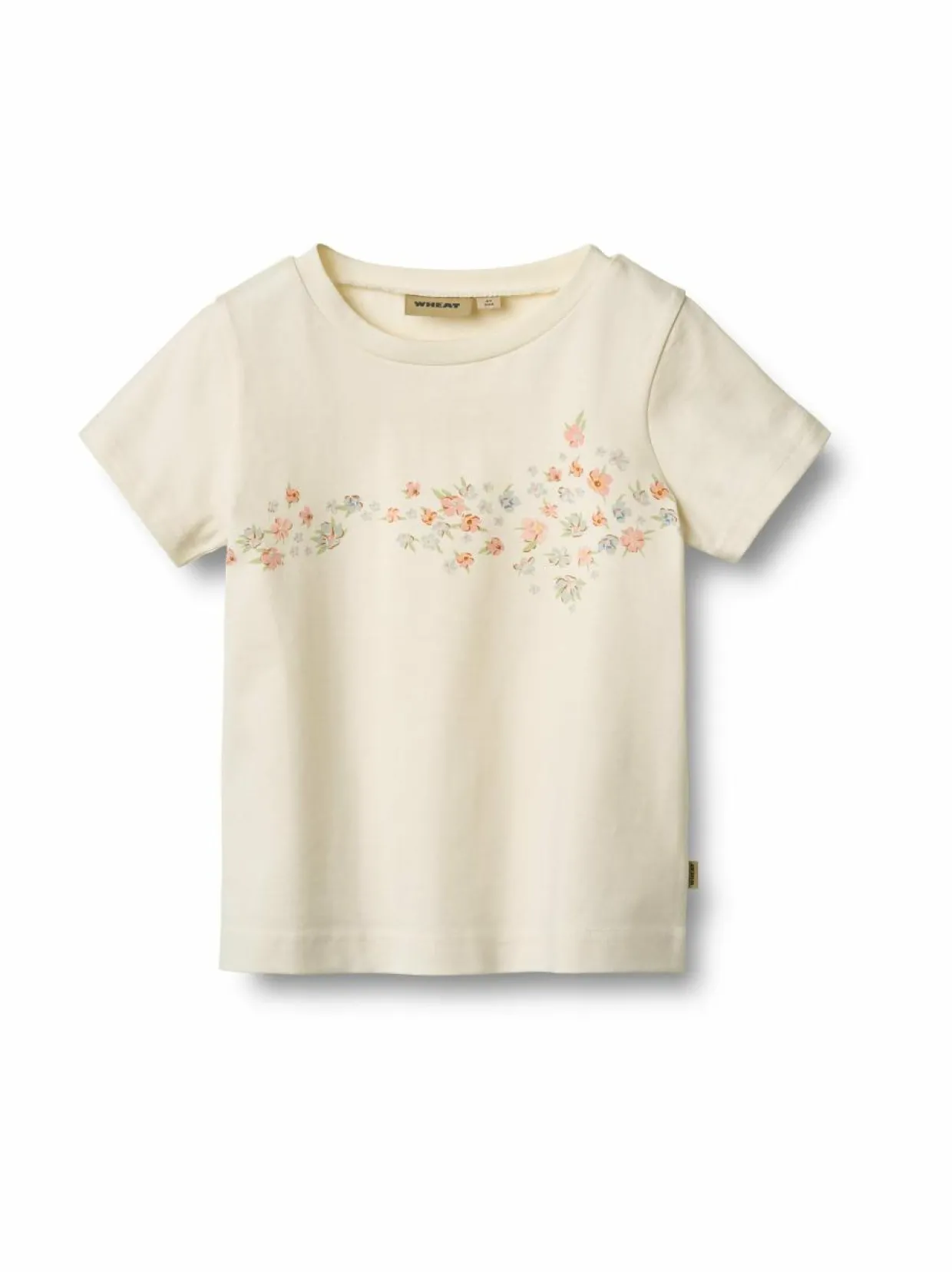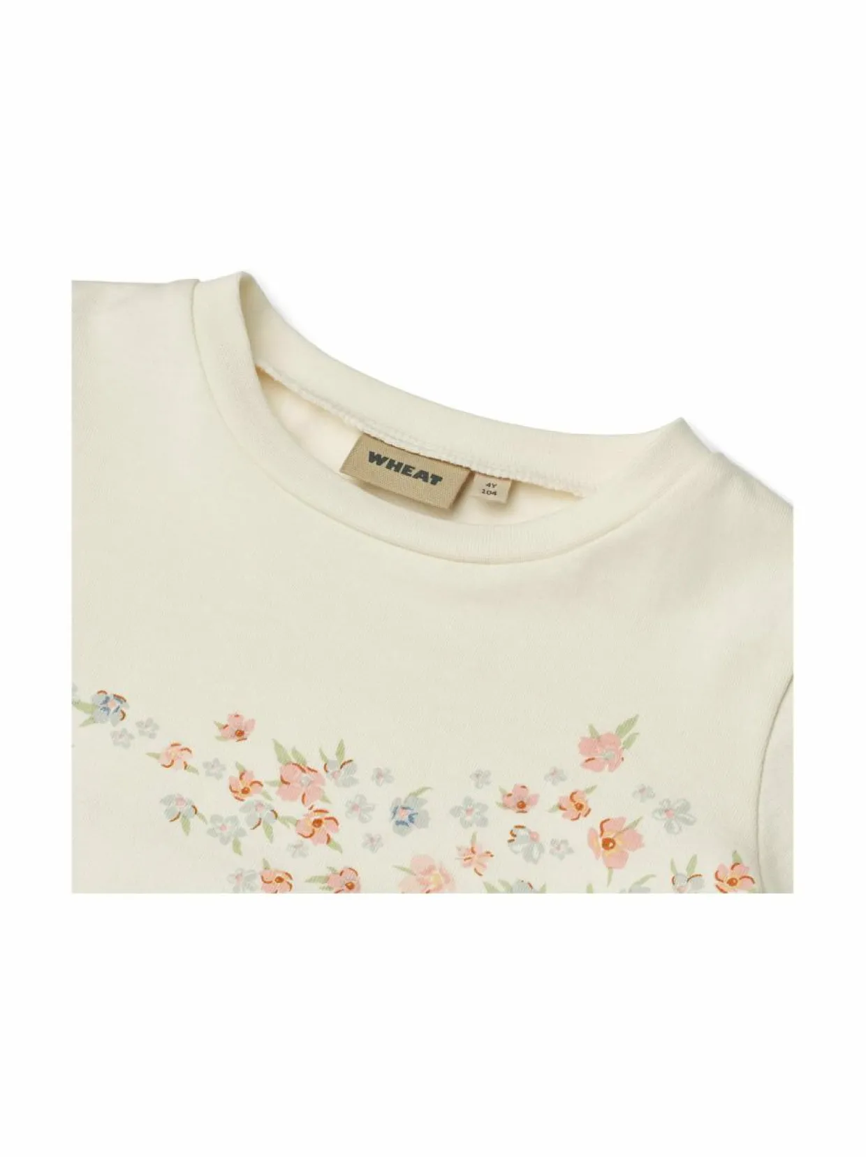 Wheat merkin Tessa t-paita on valmistettu pehmeästä luomupuuvillasta. Siinä on mukavan rento relaxed fit -istuvuus. Paidan miehustassa on kesäinen kukkakuosi. Trikoopaidan voi yhdistää housujen tai hameen kanssa. Se sopii myös erinomaisesti lisäkerroksena mekon tai haalarin alle.