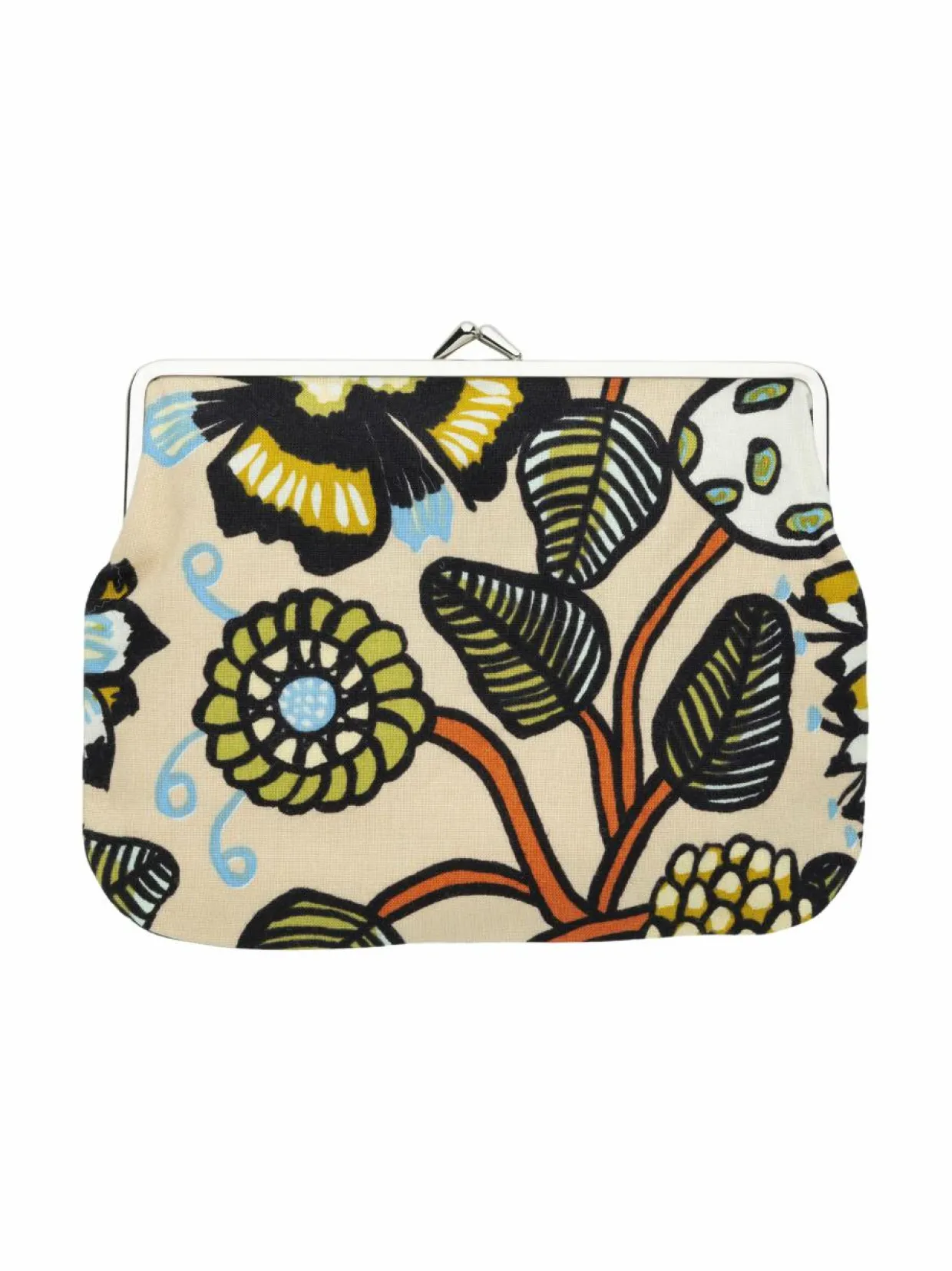 Tämä puolikas kukkaro on valmistettu 100 % luomupuuvillasta, joka on painettu Helsingissä. Kukkaron rehevä Tiara-kuosi on suunniteltu Erja Hirven toimesta, ja siinä kukkivat erilaiset kasvit ja kukat luonnon kruununa. Kukkaro on varustettu metallisella kehyksellä, joka on helppo avata ja sulkea.