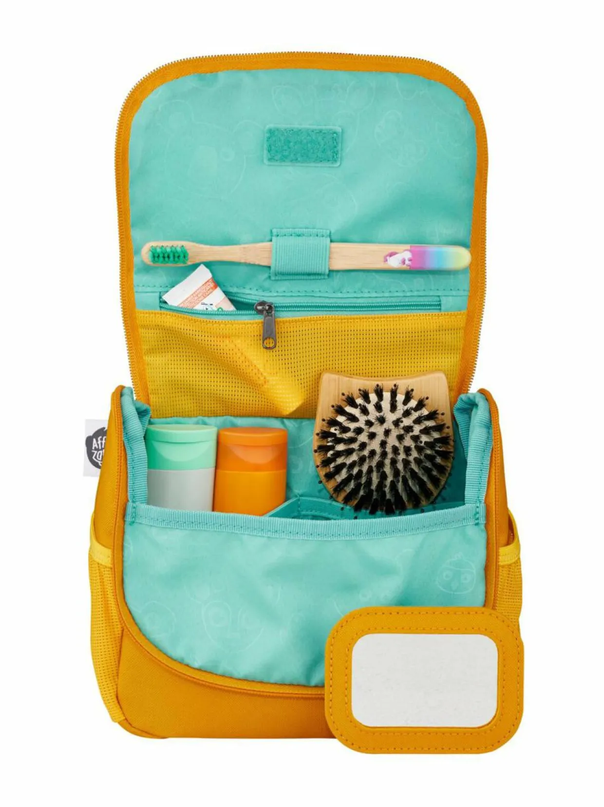 Affenzahnin toalettilaukku on suunniteltu matkalle mukaan otettavaksi. Se tarjoaa runsaasti tilaa hygieniatarvikkeille. Laukussa on sisällä vetoketjullinen verkkotasku pienille tavaroille ja useita erillisiä osioita esimerkiksi shampoolle, aurinkovoiteelle ja hammastahnalle. Kätevät verkkotaskut sivuilla pitävät harjan ja pikkupyyhkeen järjestyksessä. Laukku on helppo kiinnittää esimerkiksi naulakkoon ja siinä on myös irrotettava peili. Materiaali on vettä- ja likaahylkivä.