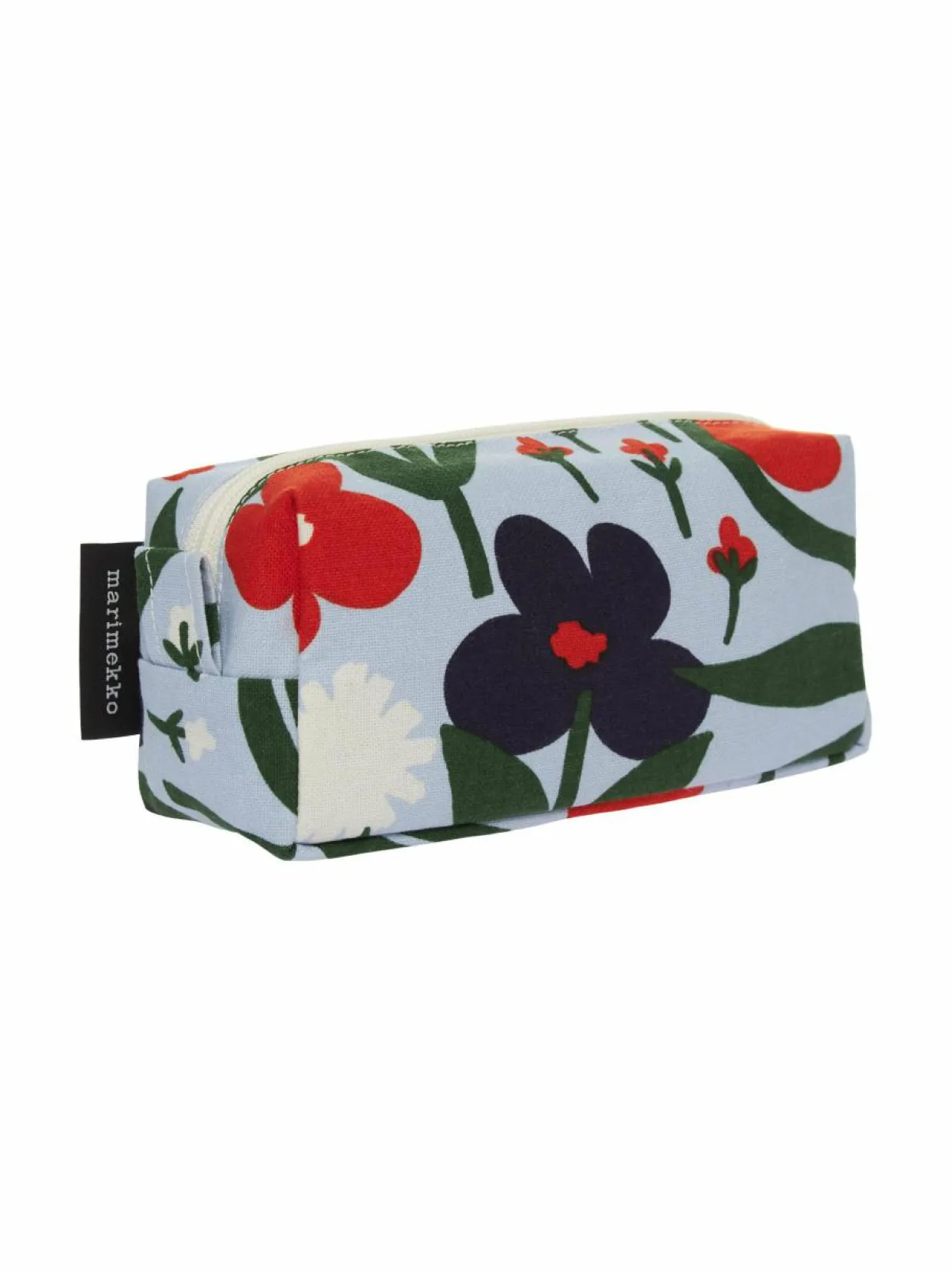 Marimekon Tiise Palsta -kosmetiikkalaukkua koristaa kukkakuvio rohkealla väriyhdistelmällä. Suunnittelija Lotta Maija on ammentanut inspiraatiota Palstan energiseen kuvioon kesämökin kukkapenkkien kasveista.