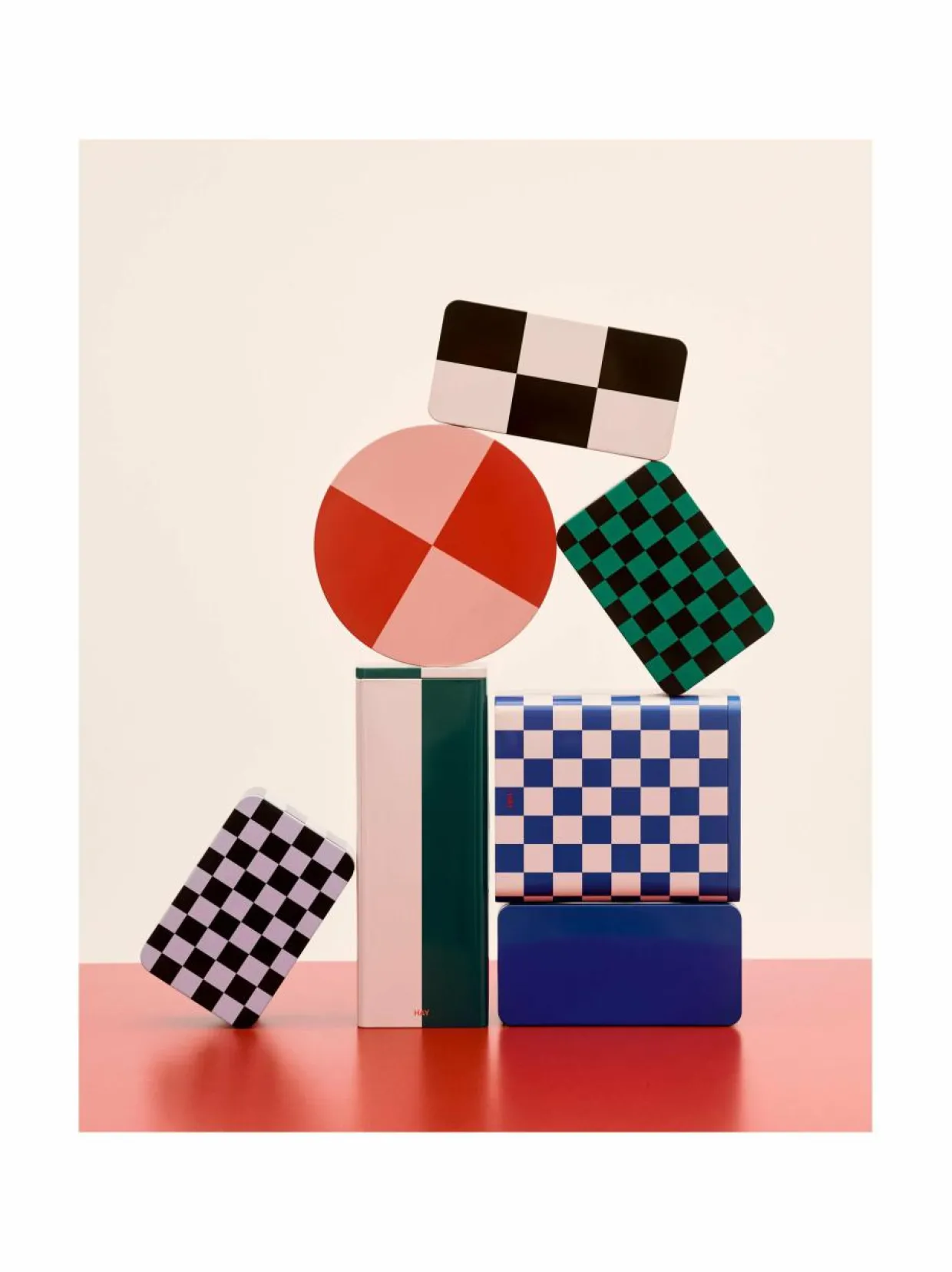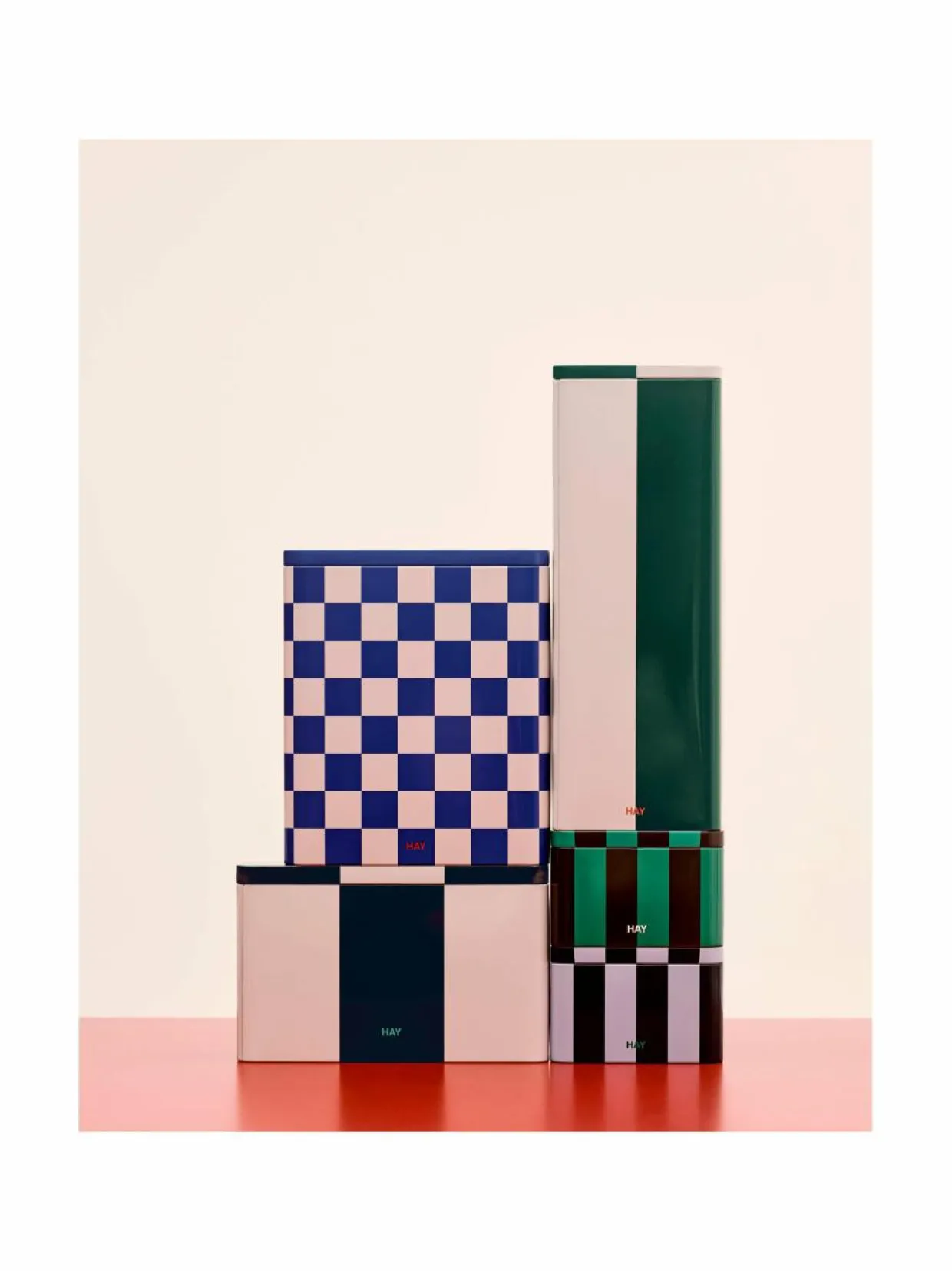 HAY:n Tin Container -sarjan säilytyslaatikot ovat sekä käytännöllisiä että koristeellisia. Laatikoissa on värikkäitä ruudukoita ja kiiltävä pinta. Kansi ja laatikko ovat tasaisesti kohdakkain, mikä luo tyylikkään ja saumattoman ulkonäön ja varmistaa samalla tiiviin istuvuuden, sopien kuiville elintarvikkeille. Tin Container -laatikot ovat saatavana monissa eri ko’oissa, muodoissa ja malleissa, ja ne voidaan asettaa koristeellisesti hyllyille tai pöydille ympäri kotia eri esineiden säilyttämiseen ja järjestämiseen.