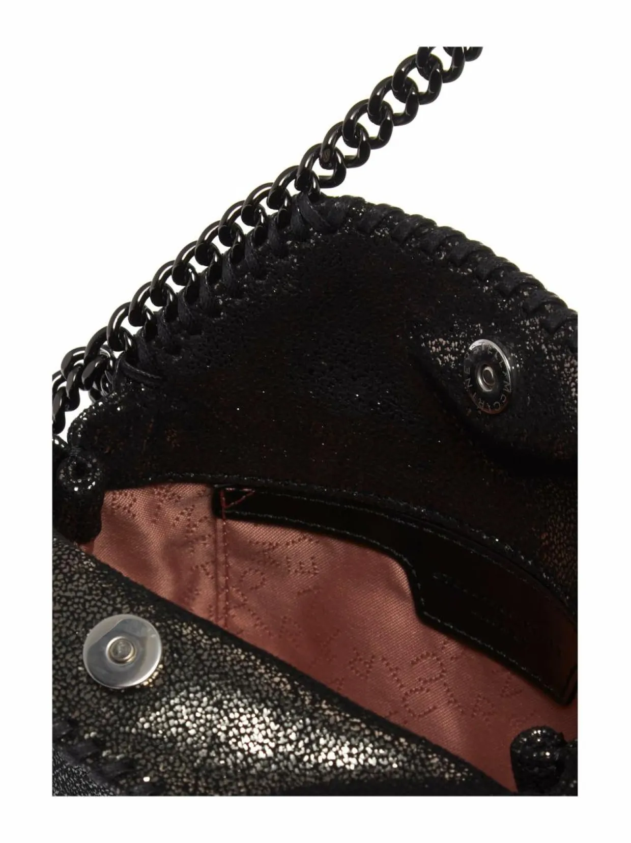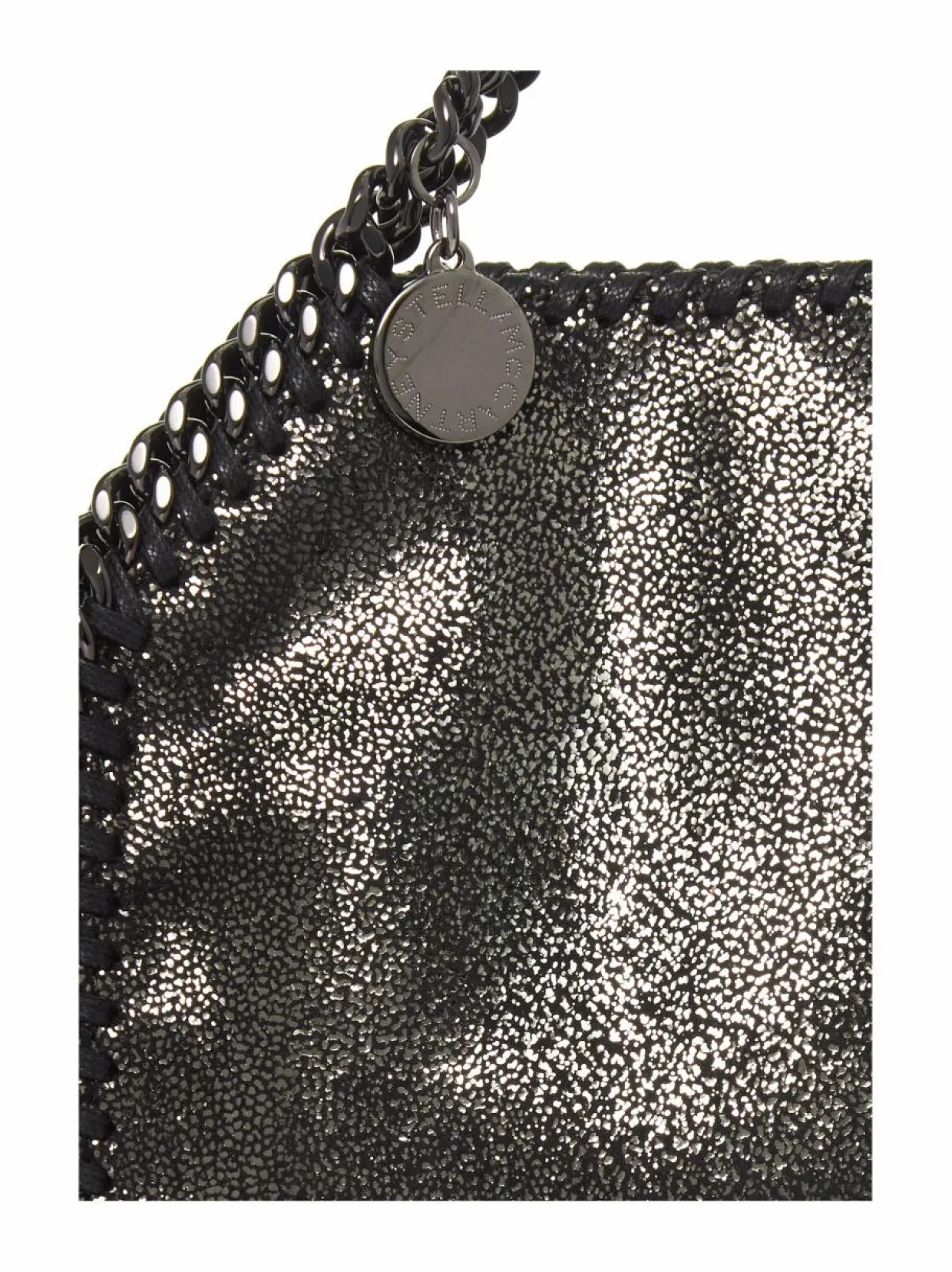 Stella McCartneyn Tiny Shiny Dotted Tote -laukun pinta on koristeltu kiiltävin pistein. Laukun reunojen ympärille on kiinnitetty ketjua ja nauhaa, jotka antavat laukulle sen ikonisen tyylin. Olkahihna ja kantolenkit ovat myös metalliketjua.