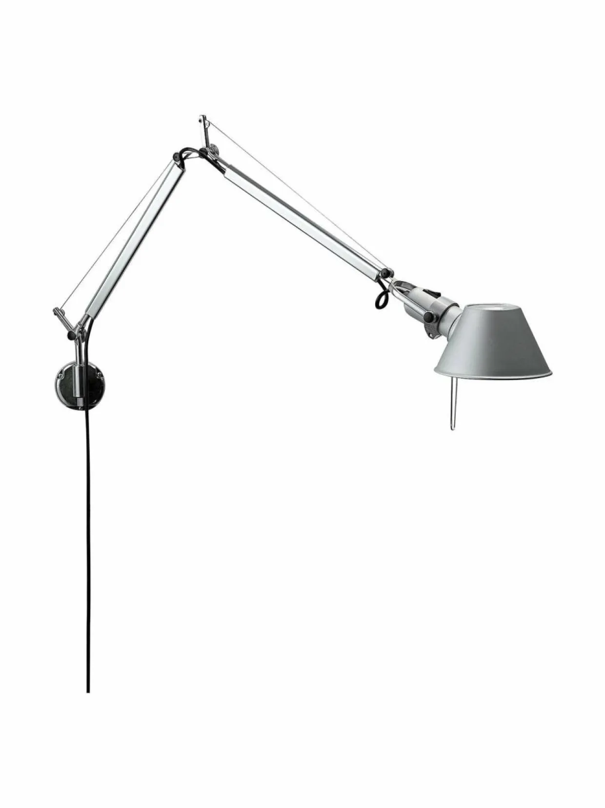 Tolomeo Mini Parete -valaisimen kartionmuotoinen varjostin on alumiinia, ja tunnusomaisen vaijerirakenteen ansiosta valon suuntaa on helppo muunnella tarpeen mukaan.