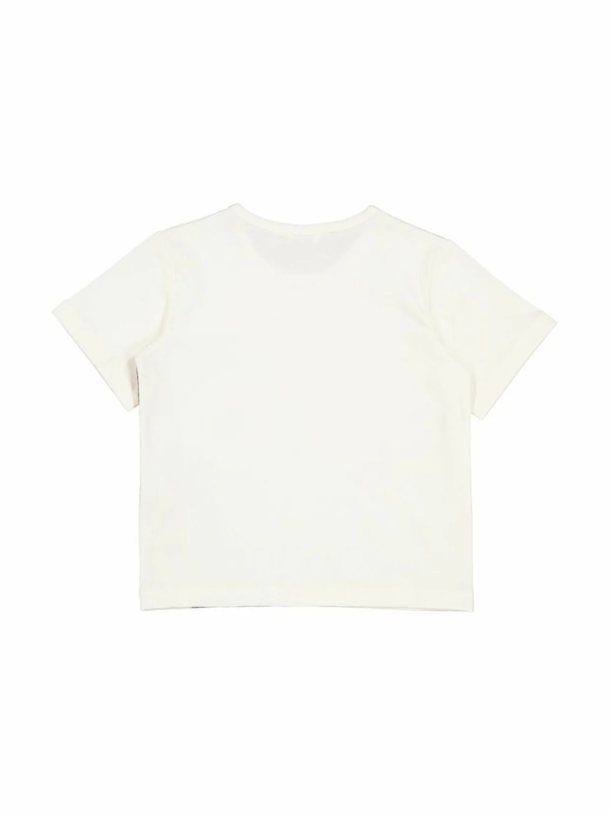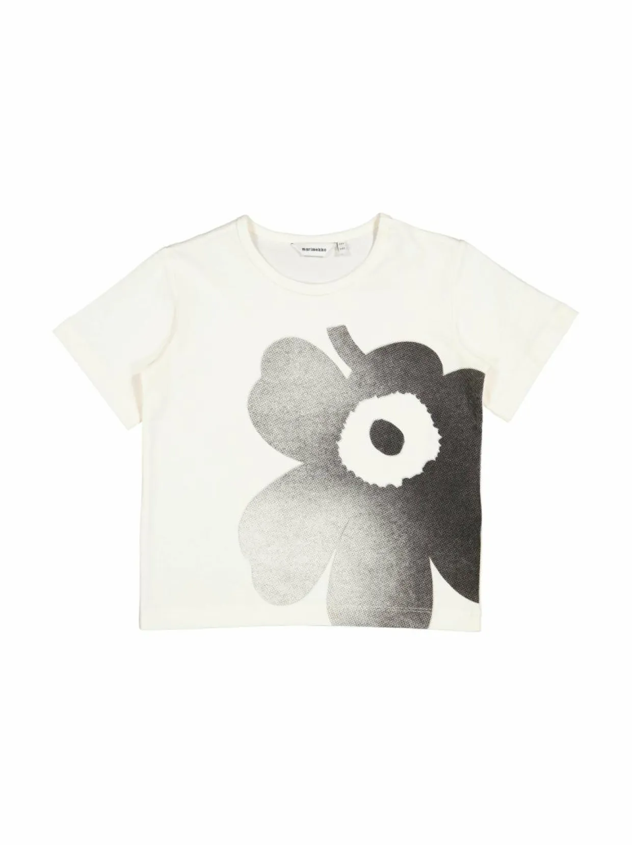 Marimekon Tonni t-paita on valmistettu luomupuuvillatrikoosta ja siinä on rento istuvuus. Lasten t-paidassa on painettu, suuri Unikko-kukka etupuolella ja resorikantilla huoliteltu pyöreä pääntie.