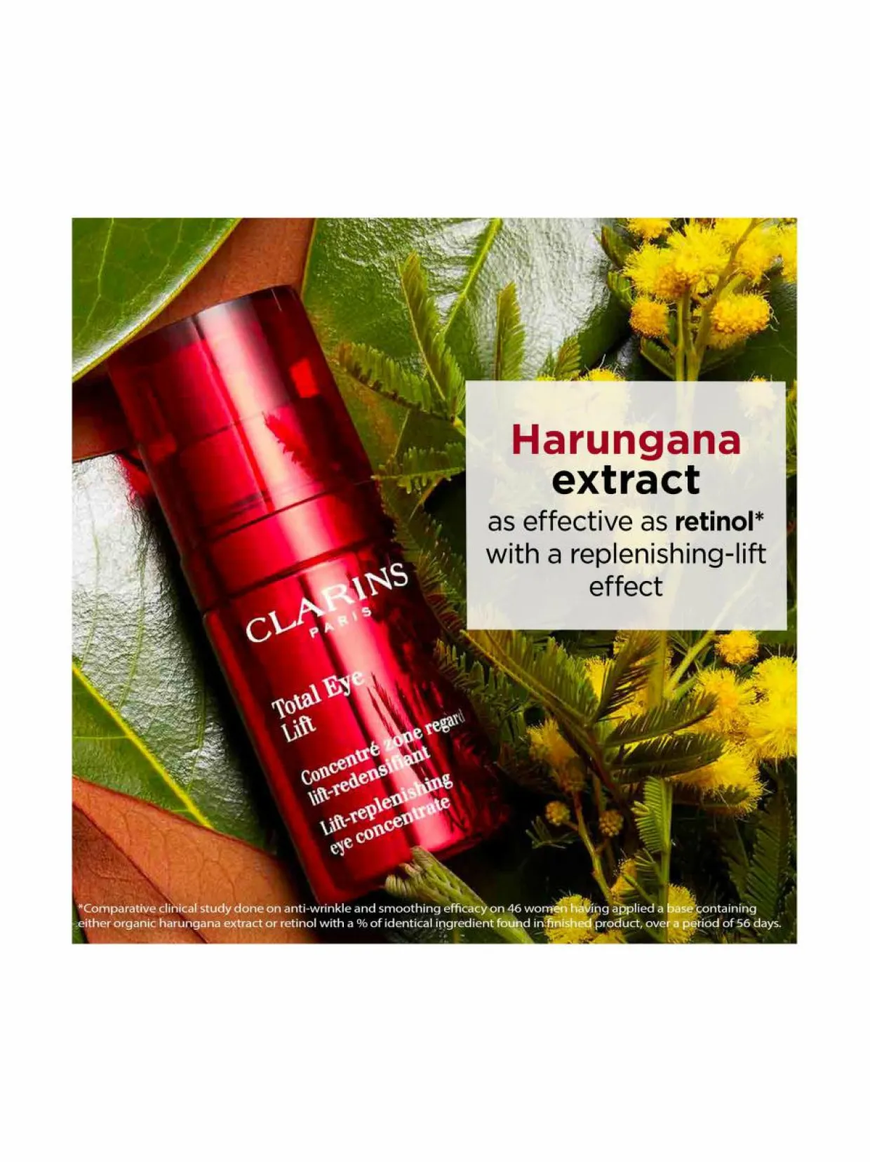 - Total Eye Lift -silmänympäryshoito sisältää luomulaatuista harungana-uutetta ja akaasiankukkaa, jotka yhdessä liftaavat ja silottavat silmänympärysihoa