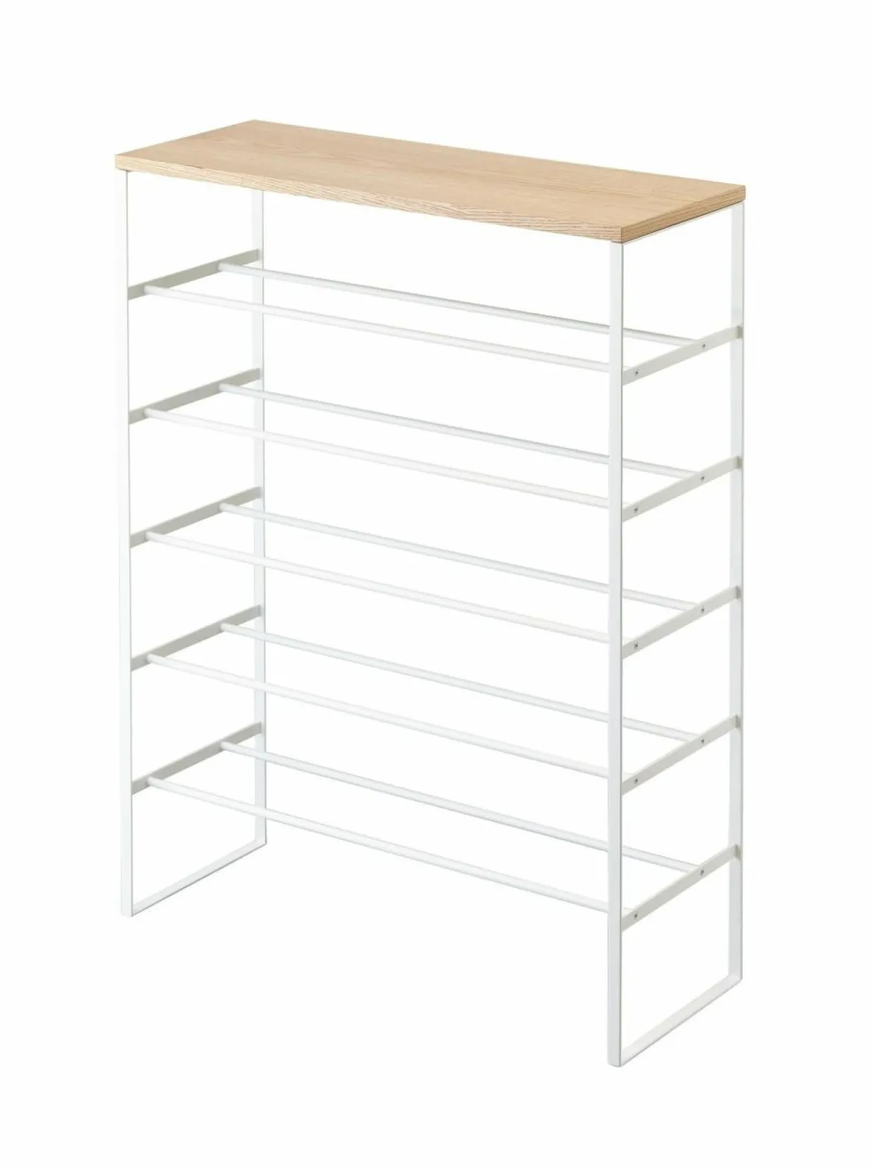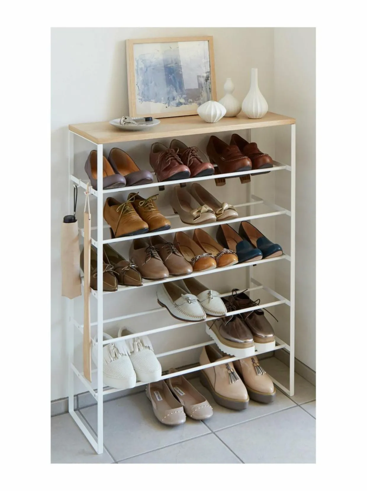 Yamazakin teräsrunkoinen Tower-kenkähylly on todellinen tilaihme! Syvyyssuunnassa hylly vie tilaa vain n. 25 cm, joten se sopii kapeaankin eteiseen tai vaatehuoneeseen. Viidellä hyllyllä on tilaa ainakin 15 kenkäparille, minkä lisäksi kenkiä mahtuu myös lattialle telineen alle. Kauniin saarniviiluisen tason päällä taas voi säilyttää vaikkapa avaimia tai aurinkolaseja. Lisäksi hyllyn päädyssä on kaksi irrotettavaa koukkua, joihin esimerkiksi sateenvarjo tai kenkälusikka on kätevä laittaa roikkumaan. Teräshyllyt on helppo pitää siistinä kostealla liinalla pyyhkimällä. Tuote on koottava. Suunniteltu Japanissa.
