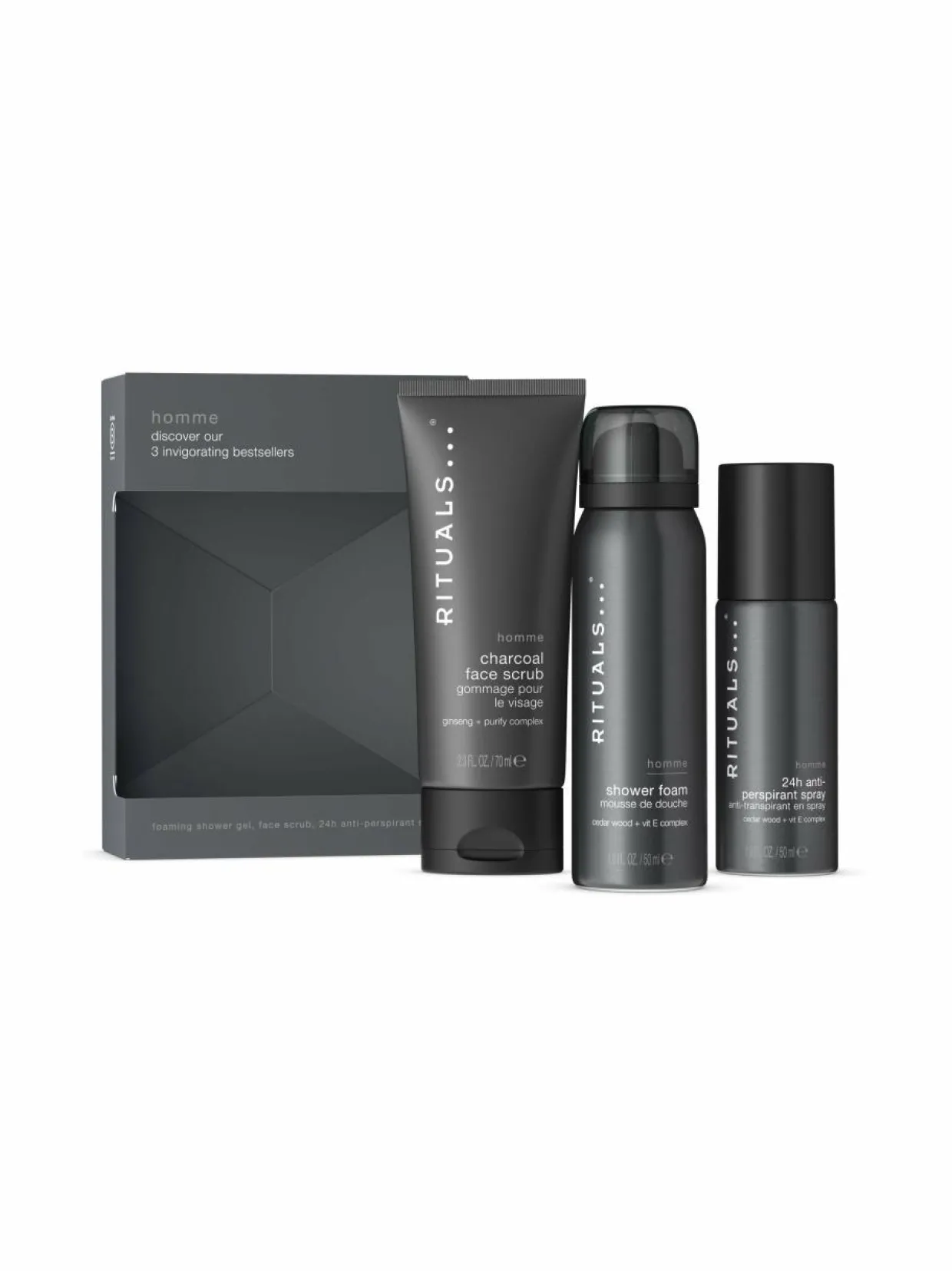 Tuotenumero169833334 ValmistusmaaSaksa VäriNOCOL Koko1 AinesosaluetteloRituals Homme shower foam 50ml: Aqua/Water, Sodium Coco-Sulfate, Sorbitol, Coco-Glucoside, Isopentane, Caprylyl/Capryl Glucoside, Cocamidopropyl Betaine, Isopropyl Palmitate, Parfum/Fragrance, PEG-120 Methyl Glucose Dioleate, Isobutane, Tocopheryl Acetate, Juniperus Virginiana (Cedar) Wood Extract, Tocopherol, Citric Acid, Sodium Benzoate, Sodium Chloride, Glycerin, Guar Hydroxypropyltrimonium Chloride, Citronellol, Limonene, Coumarin. Rituals Homme 24h Anti-Perspirant Spray 50ml: Butane, Propane, Aluminum Chlorohydrate, Isopropyl Palmitate, Isobutane, Dicaprylyl Ether, C12-15 Alkyl Benzoate, Parfum/Fragrance, Octyldodecanol, Cedrus Libani Bark Extract, Tocopheryl Acetate, Ethylhexylglycerin, Tocopherol, Disteardimonium Hectorite, Propylene Carbonate, Aqua/Water, Caprylic/Capric Triglyceride, Citral, Citronellol, Coumarin, Linalool, Limonene. Homme Charcoal Face Scrub 70ml: Aqua/Water, Cetearyl Alcohol, Glycerin, Bambusa Arundinacea Stem Powder, Butyrospermum Parkii (Shea) Butter, Oryza Sativa (Rice) Bran Oil, Palmitic Acid, Stearic Acid, Helianthus Annuus (Sunflower) Seed Oil, Caprylic/Capric Triglyceride, Vitis Vinifera (Grape) Seed Oil, Parfum/Fragrance, Panax Ginseng Root Extract, Charcoal Powder, Sodium Cetearyl Sulfate, Tocopherol, Xanthan Gum, Phytic Acid, Citric Acid, Limonene, Linalool, Citronellol, Caprylyl Glycol, Decylene Glycol, Potassium Sorbate, Phenoxyethanol. AvainsanatRituals, trial set, ihonhoitopakkaus