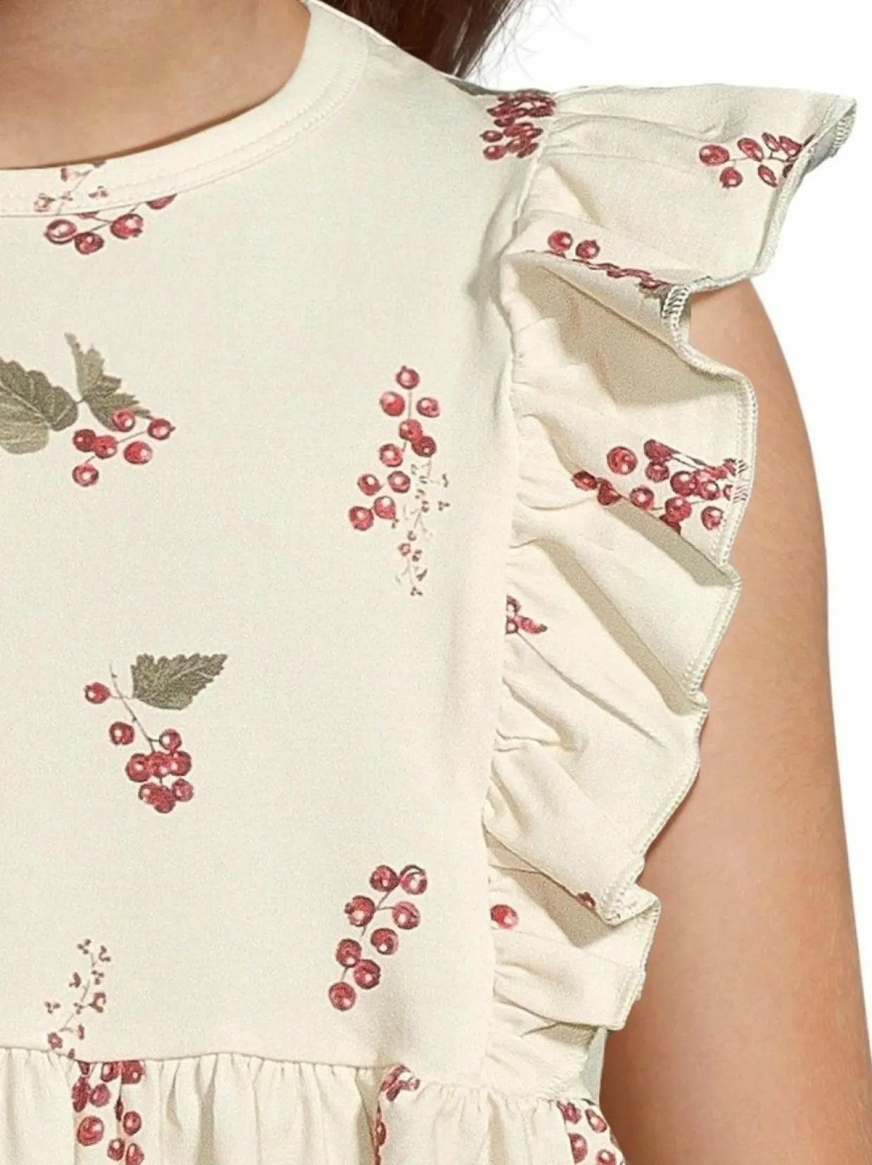 Petit Piao -merkin mekko on valmistettu hengittävästä luomupuuvillan ja modaalin sekoitteesta, johon on lisätty elastaania tuomaan joustoa. Mekossa on suloinen printti, frillahihat sekä laskostus vyötäröllä. Rento trikoomekko sopii jokaiseen päivään.