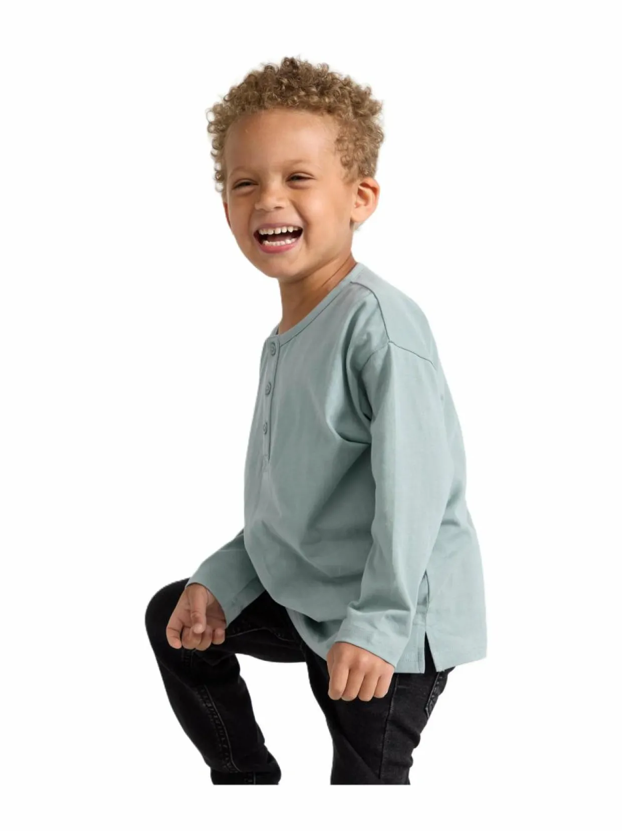 Lindexin pitkähihaisessa trikoopaidassa on pyöreä pääntie ja nappikiinnitys. Helmassa on pienet sivuhalkiot. Materiaali on pehmeää ja hengittävää puuvillaa, johon ripaus elastaania tuo käyttömukavuutta.