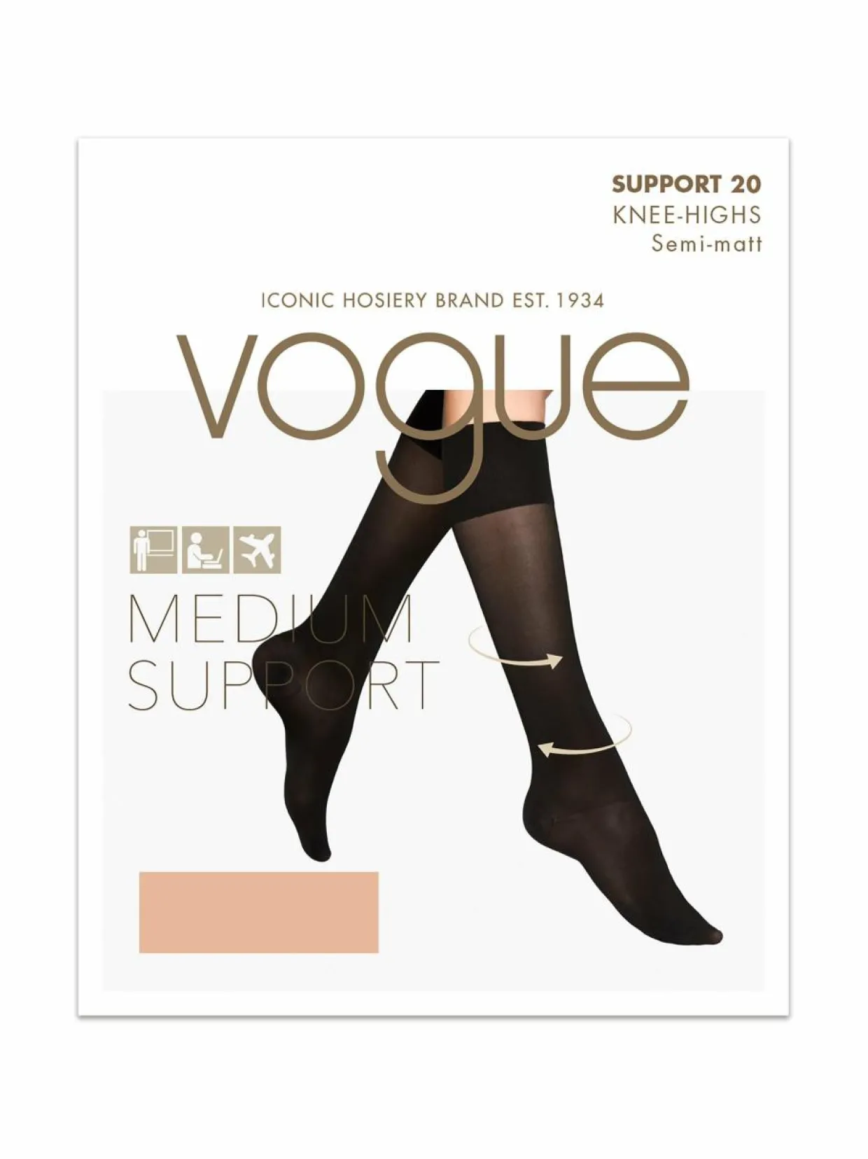 Vogue’in himmeäkiiltoiset tukipolvisukat virkistävät jalkoja sekä aktivoivat verenkiertoa.