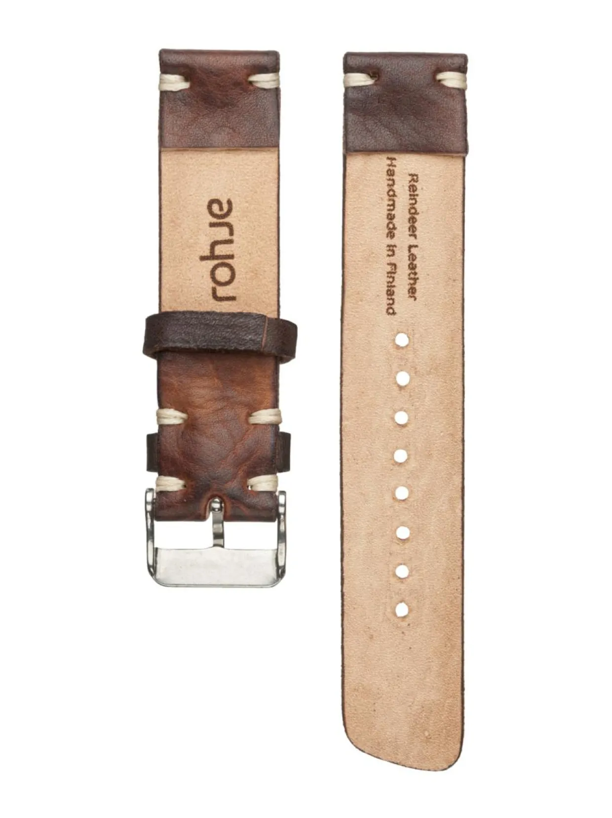 Rohje-poronnahkarannekkeet valmistetaan Suomessa Tampereella suomalaisesta poronnahasta. Rannekemalli on kaksiosainen ja 20mm leveä. Poronnahka on hyvin laskeutuvaa, kevyttä, erittäin pehmeää, mutta samalla kuitenkin vahvaa ja kestävää. Käsityöläisyyden leima tulee esille rannekkeen yksityiskohdissa ja jokainen ranneke onkin uniikki yksilö. Siinä ei ole käytetty muovia ja se on päällystetty mehiläisvahalla – täysin luonnontuote. Poronnahka on kestävästi tuotettu raaka-aine ja se muodostuu aina poronhoidon sivutuotteenna. Rannekkeen mukana tulevat 20mm jousitapit kelloon kiinnitystä varten.