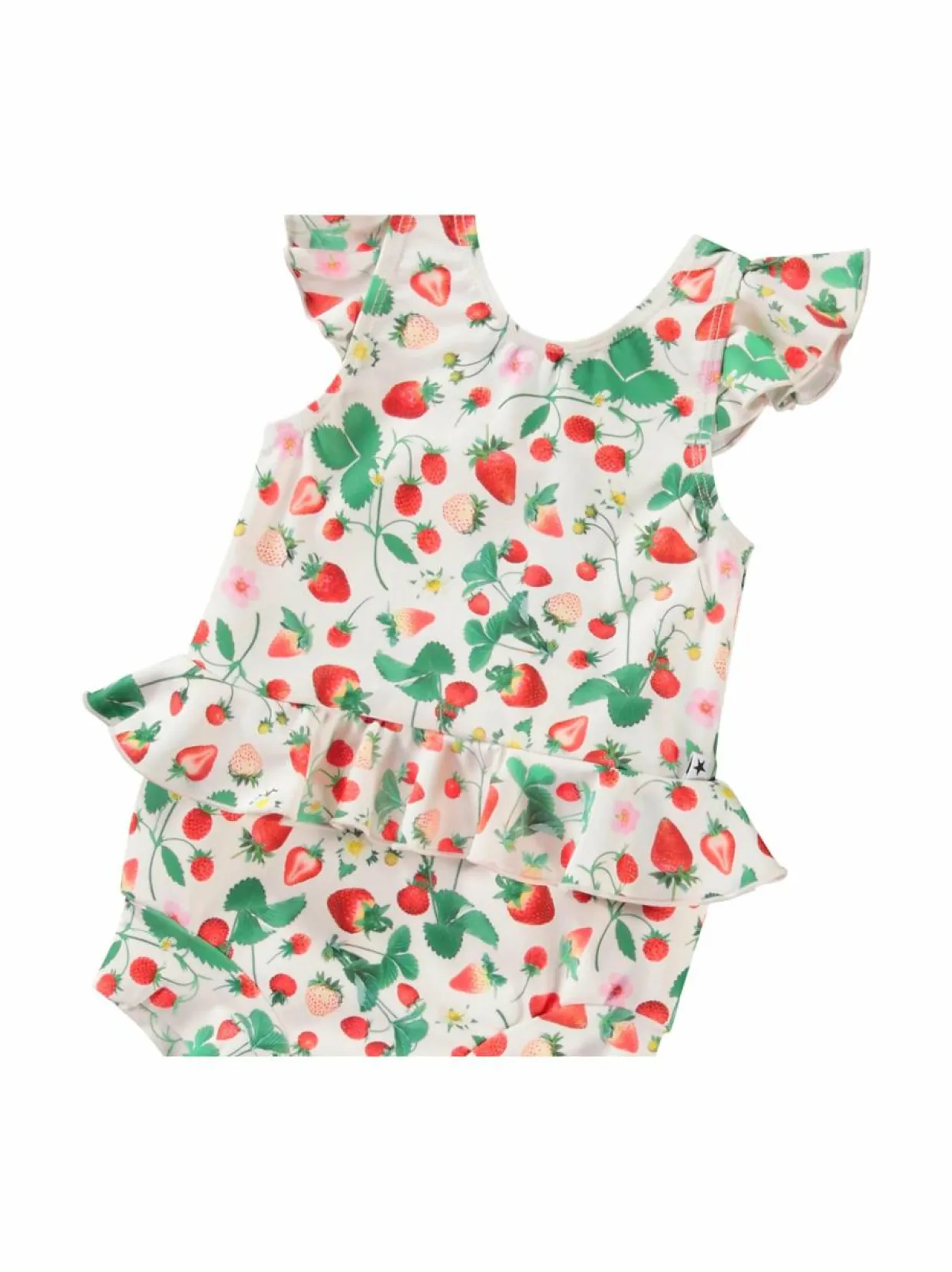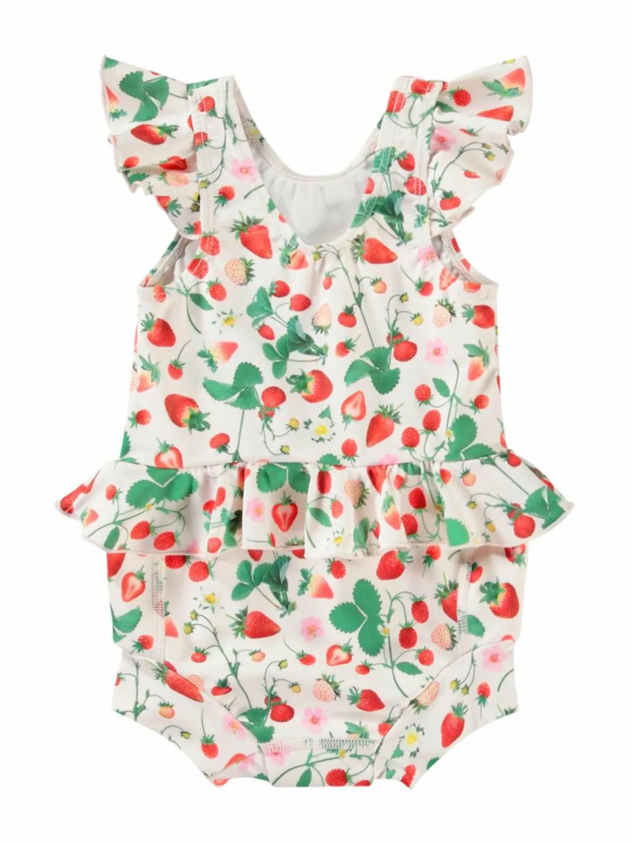 Molo-merkin uimapuku on valmistettu pehmeästä ja joustavasta materiaalista, joka on mukava käyttää. Uimapuvussa on kaunis mansikkakuviointi sekä suloiset röyhelöt, jotka tekevät siitä ainutlaatuisen. Se on täydellinen lapselle, joka haluaa tuntea olonsa mukavaksi uima-altaalla tai rannalla. Polyesteri on kestävä ja helppohoitoinen materiaali, joka kuivuu nopeasti. Elastaani tekee materiaalista joustavan ja mukavan käyttää.