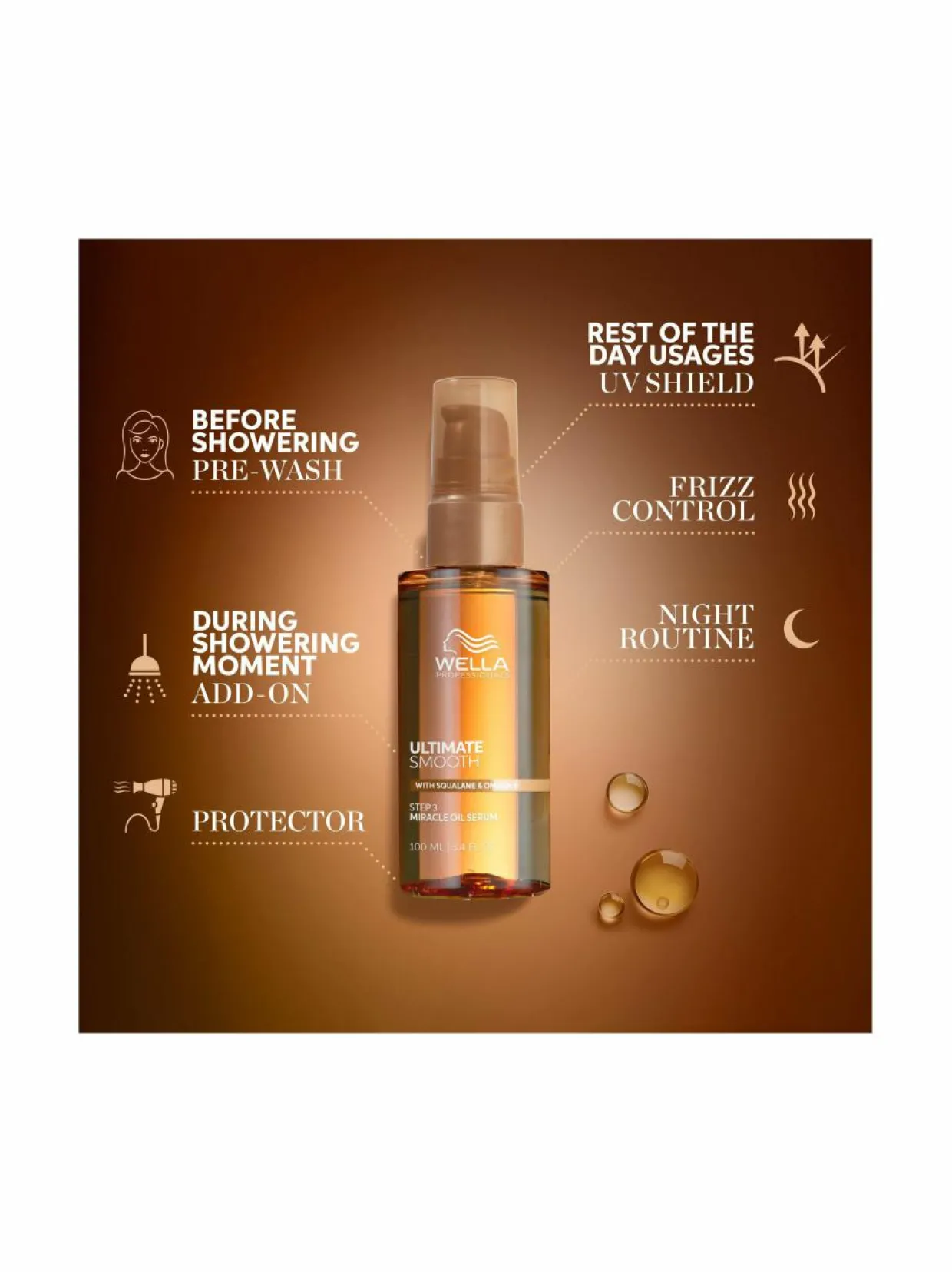 Wella Professionals Ultimate Smooth Miracle Oil Serum on herkkä hiusöljy (seerumin koostumuksella), joka ravitsee hiuksia syvästi sisältä ja ulkoa jättäen ne näkyvästi sileämmiksi ja kiiltävämmiksi – raviten hiuksiasi 30 sekunnissa sileydellä, joka kestää jopa 3 päivää. Sisältää skvalaania ja omega-9-rasvahappoja.