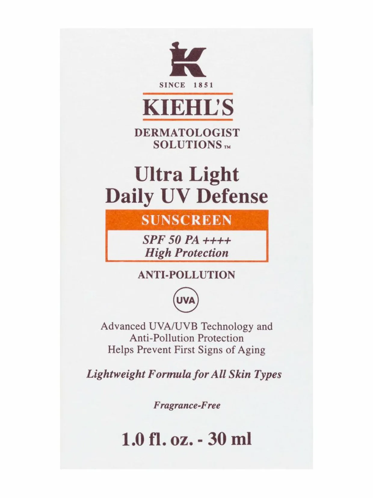 Päivittäiseen käyttöön kasvoille tarkoitettu Kiehl’s-aurinkosuojavoide sisältää ympäristön haittavaikutuksilta, kuten saasteilta, suojaavia mineraaleja. Voide suojaa tehokkaasti UVB-säteiltä ja sekä lyhyiltä että pitkiltä UVA-säteiltä. Voide tekee ihosta pehmeämmän tuntuisen, kosteutetun ja heleän.