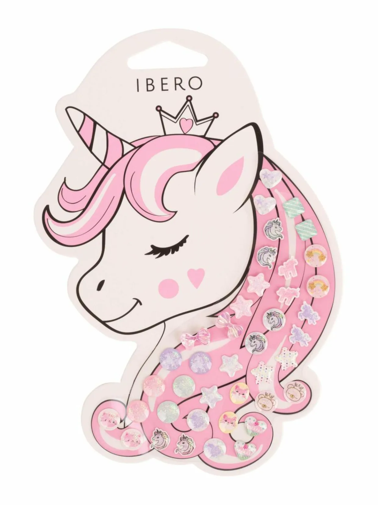 Iberon yksisarvinen tuo ripauksen taikuutta pikkuprinsessojen päivään! Kortista löydät 20 paria (yhteensä 40 kpl) kauneimpia tarrakorvakoruja, jotka korvissa mikään ei ole mahdotonta. Kortin takana on kiva värityskuva ja Iberon oma yksisarvinen.