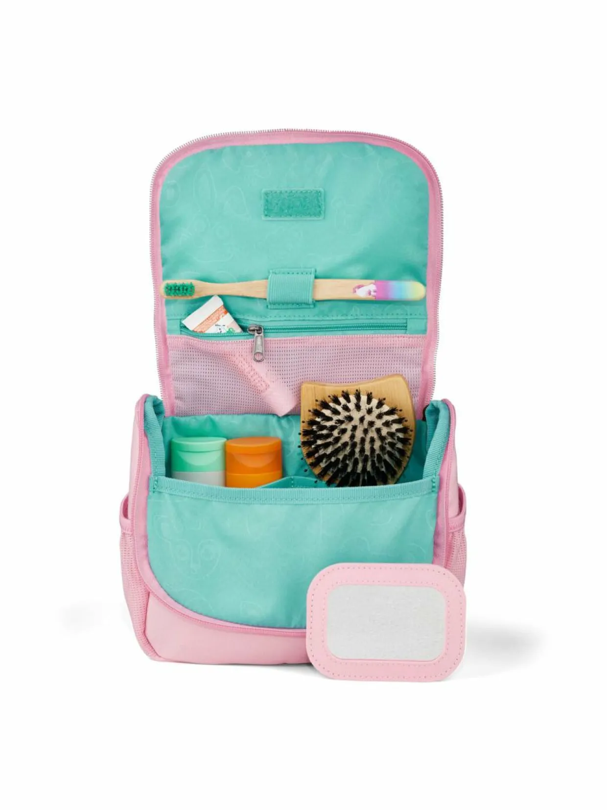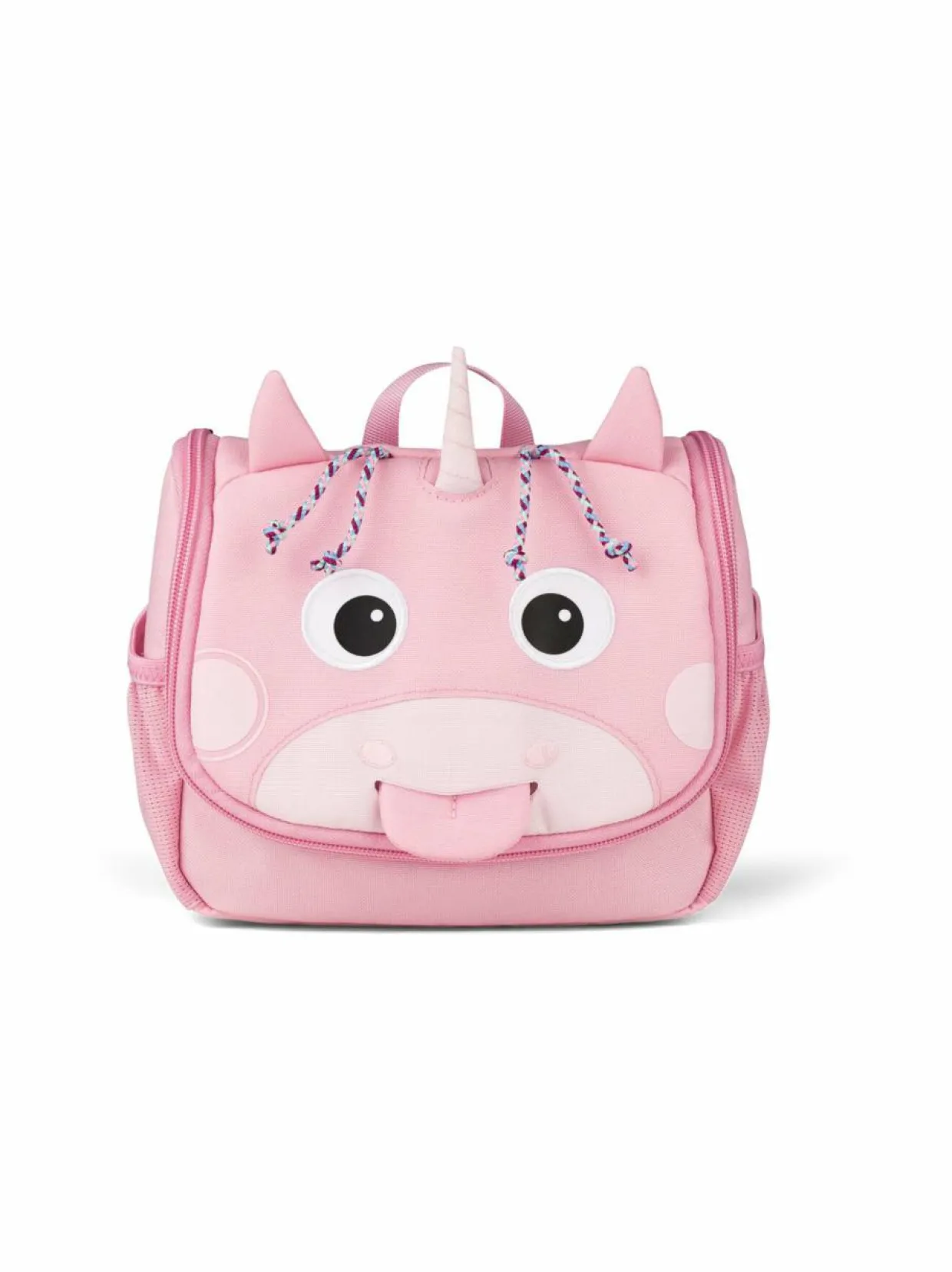 Affenzahnin toalettilaukku on suunniteltu pitämään lasten hygieniatarvikkeet järjestyksessä ja helposti saatavilla. Laukun iloinen ja uniikki design, jossa on irrotettava peili ja monia taskuja, tekee siitä käytännöllisen ja lapsen omia tavaroita varten. Laukussa on kantokahva ja koukku, jonka avulla sen voi ripustaa esimerkiksi naulakkoon. Laukku on valmistettu vettä- ja likaahylkivästä materiaalista.
