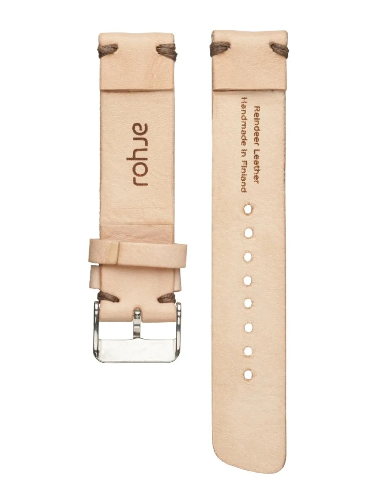 Rohje-poronnahkarannekkeet valmistetaan Suomessa Tampereella suomalaisesta poronnahasta. Rannekemalli on kaksiosainen ja 20mm leveä. Poronnahka on hyvin laskeutuvaa, kevyttä, erittäin pehmeää, mutta samalla kuitenkin vahvaa ja kestävää. Käsityöläisyyden leima tulee esille rannekkeen yksityiskohdissa ja jokainen ranneke onkin uniikki yksilö. Siinä ei ole käytetty muovia ja se on päällystetty mehiläisvahalla – täysin luonnontuote. Poronnahka on kestävästi tuotettu raaka-aine ja se muodostuu aina poronhoidon sivutuotteenna. Rannekkeen mukana tulevat 20mm jousitapit kelloon kiinnitystä varten.