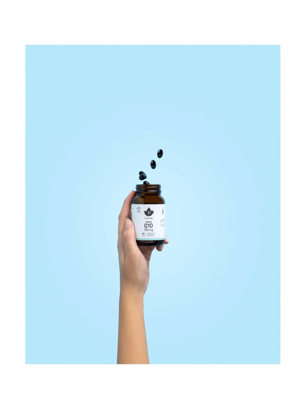 Vahva ubikinoni Q10 ekstra-neitsytoliiviöljyssä, valolta suojaavassa kapselissa.