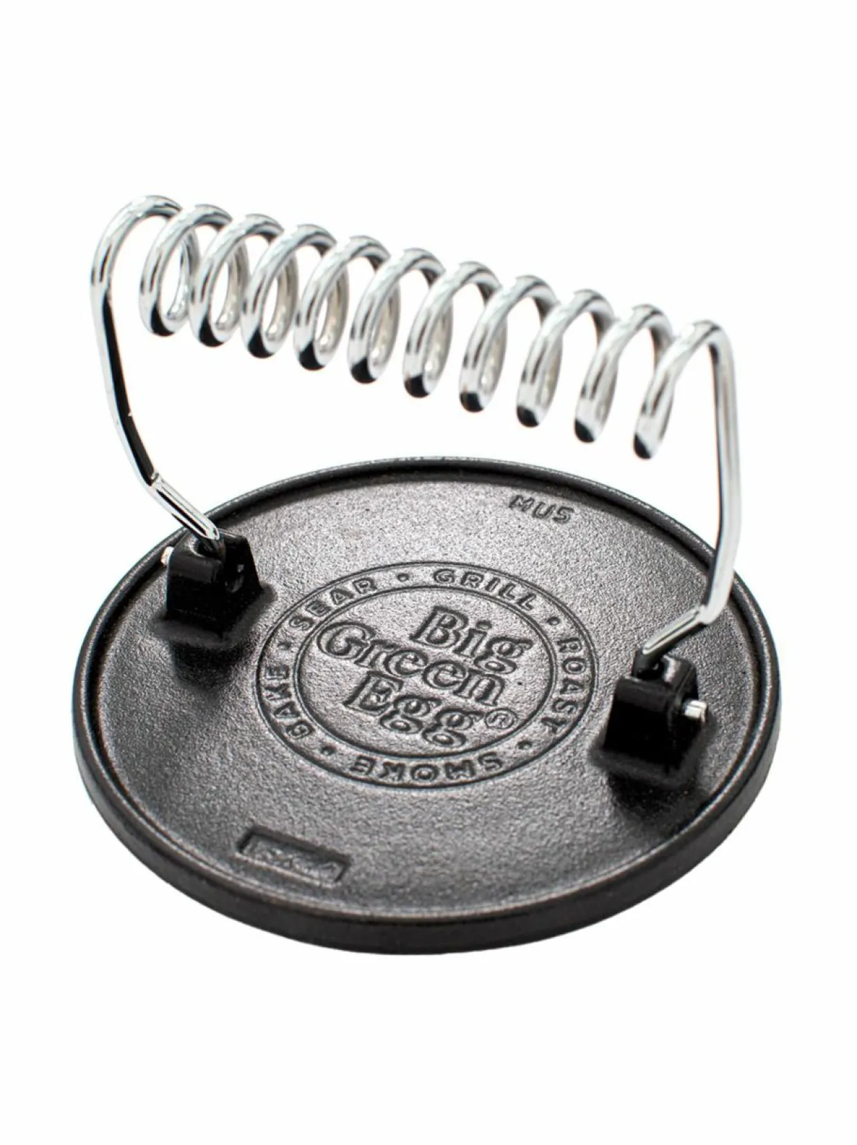 Big Green Eggin valurautainen prässi auttaa unelmien pihvin valmistamisessa – se estää ainesosien muodonmuutosta ja varmistaa kontaktilämmön. Pihvistä tulee sisältä mehukas ja ulkoa rapea.