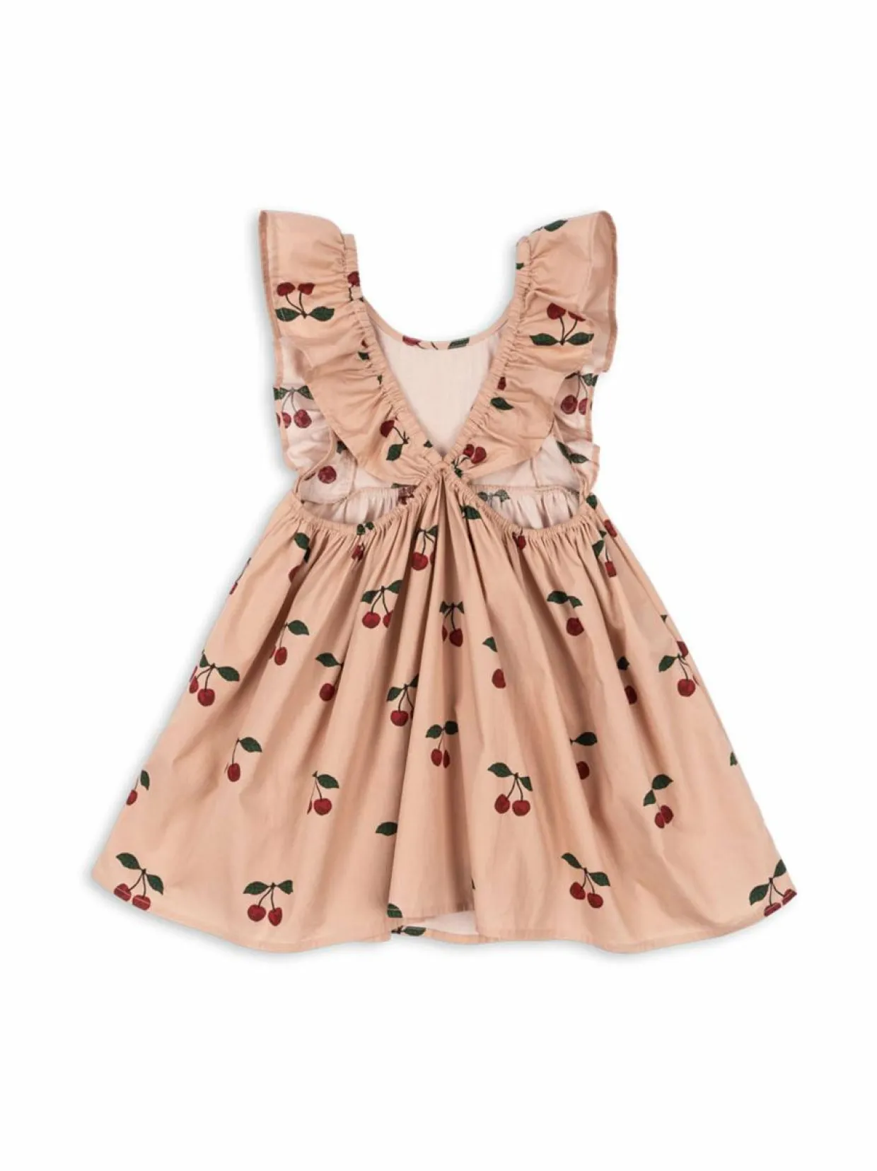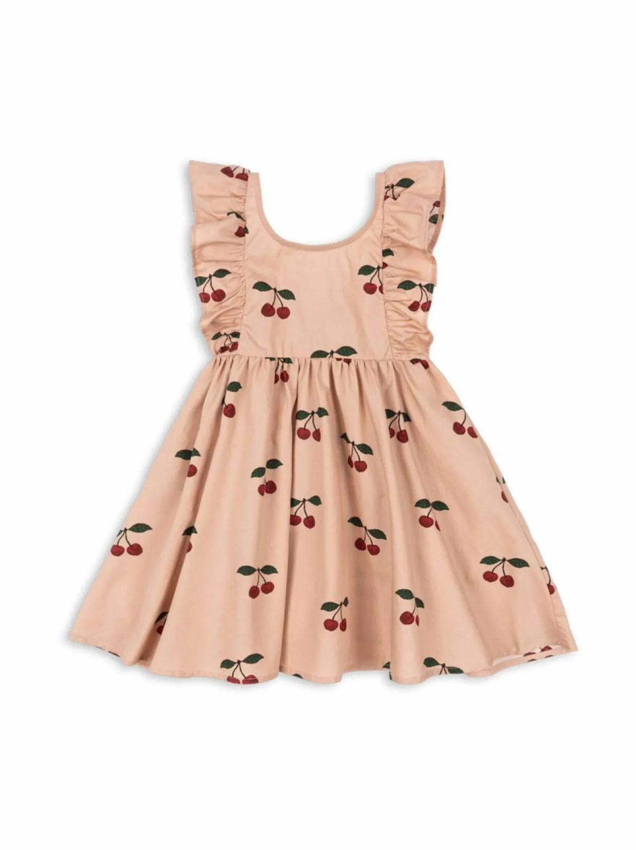 Suloinen Verbena-mekko on valmistettu pehmeästä ja hengittävästä luomupuuvillasta ja siinä on kaunis kuviointi ja. Söpöt kirsikka-kuviot ja rypytetyt hihat avoin selkäosa, joka on koristeltu rypytyksillä. Mekko on helppo pukea ja riisua ja se sopii täydellisesti lämpimiin päiviin. Luomupuuvilla on pehmeää ja hengittävää, ja se on ihanteellinen materiaali vauvojen ja lasten vaatteille.