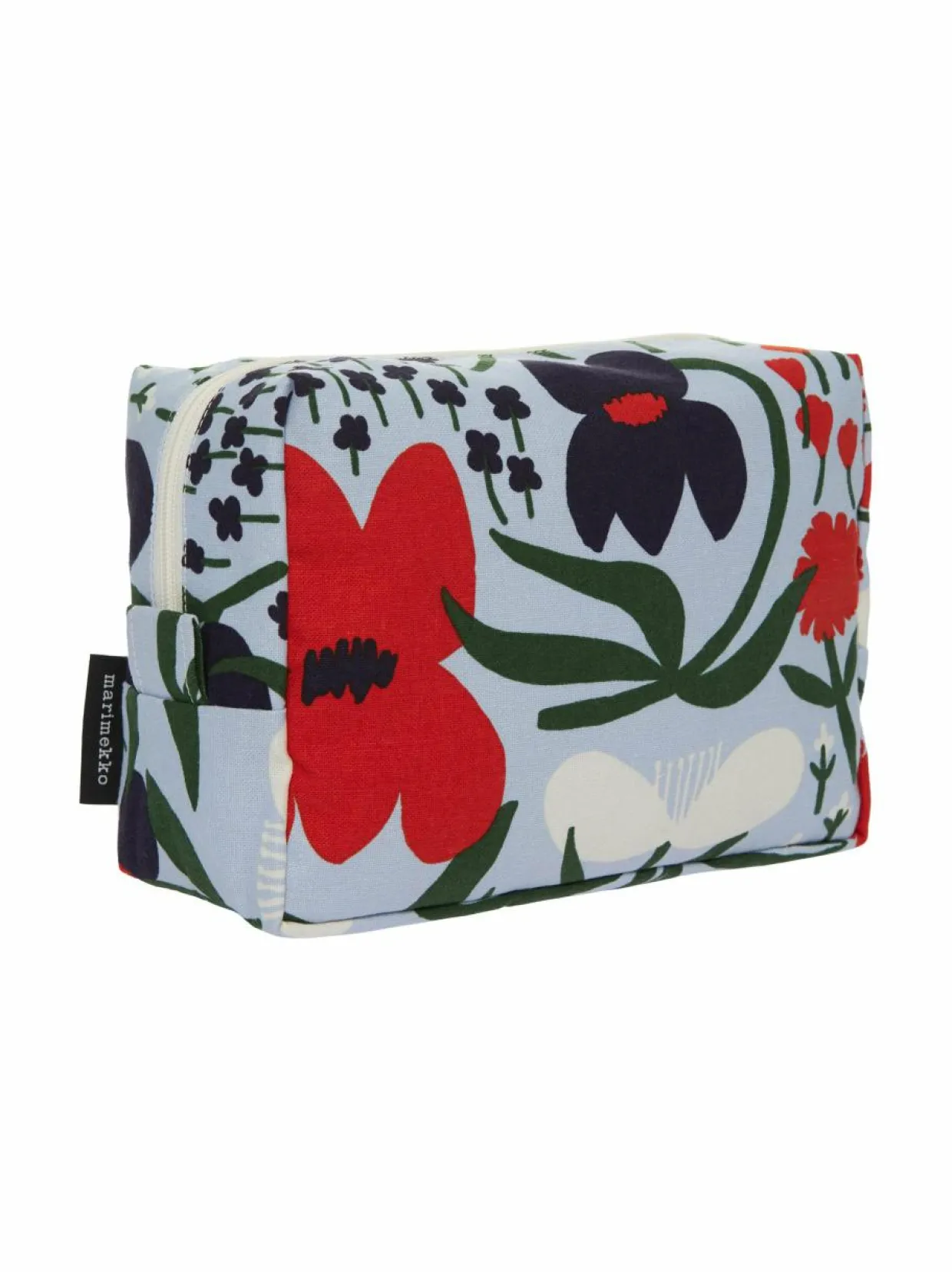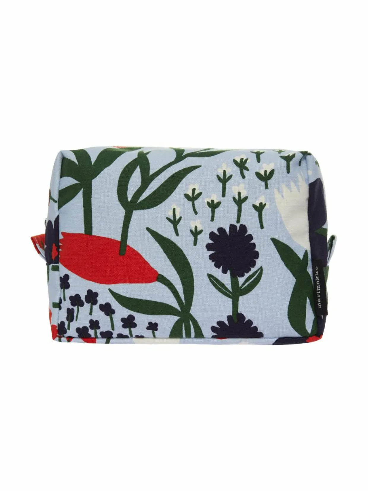 Marimekon Vilja Palsta -kosmetiikkalaukkua koristaa kukkakuvio rohkealla väriyhdistelmällä. Suunnittelija Lotta Maija on ammentanut inspiraatiota Palstan energiseen kuvioon kesämökin kukkapenkkien kasveista.