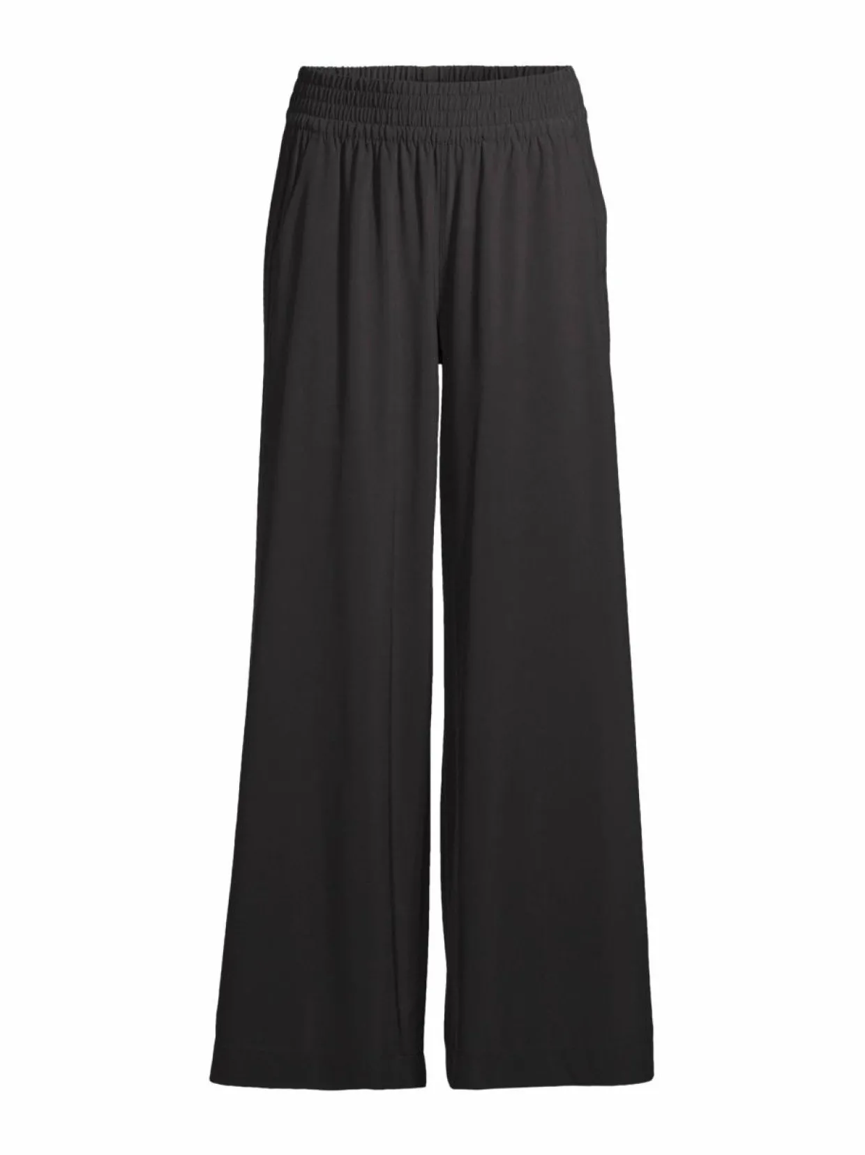 Mukavan leveälahkeiset kevyet housut Vuori-merkiltä. Villa-housuissa on neljään suuntaan joustava ja kosteutta siirtävä kangas, joka tuntuu silkkimäisen pehmeältä iholla. Tuote sisältää 45 % kierrätettyä polyesteriä. Vyötärölinja on korkea ja joustava.