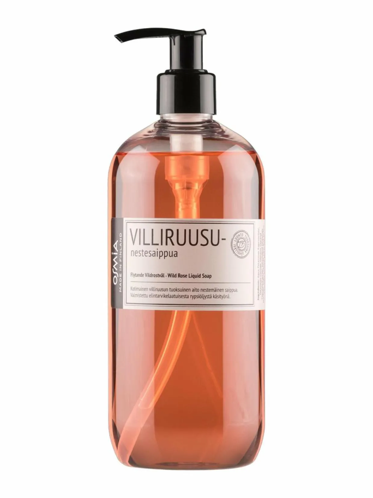 Osmian villiruusuntuoksuinen nestesaippua hellii ihoa ja mieltä. Aito nestesaippua on valmistettu käsityönä kookos- ja rypsiöljystä. Se vaahtoaa pehmeästi ja pesee ihanan puhtaaksi kuivattamatta ihoa.