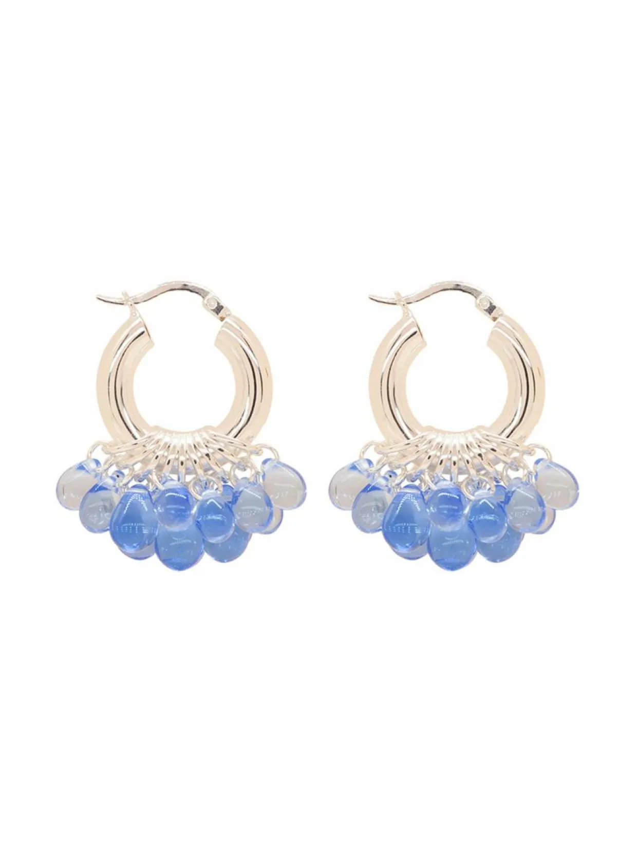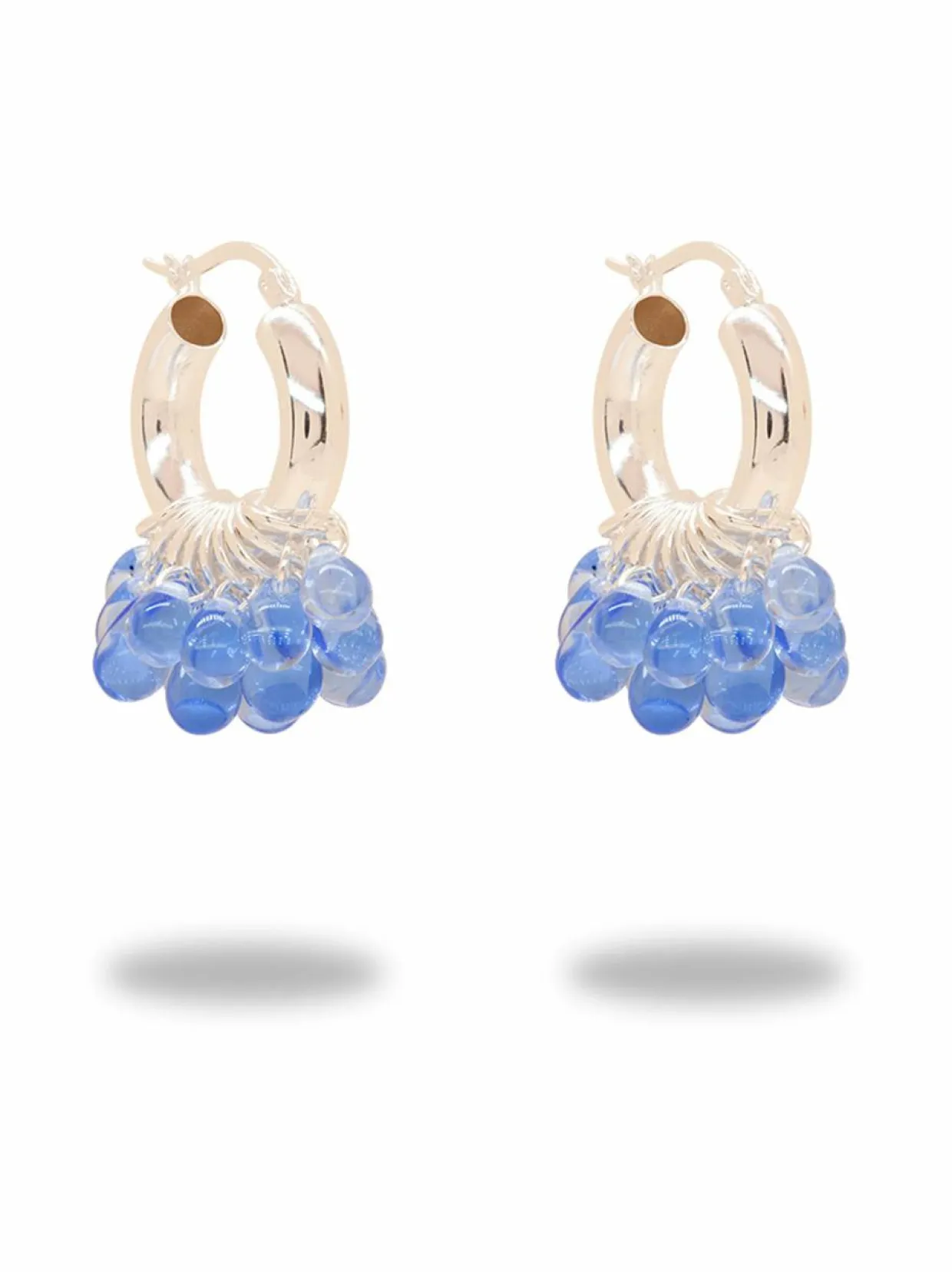 Wavy Baby -korvakoruissa on hopealla päällystetyt 925 sterling-hopearenkaat ja lasihelmiä.Korut valmistetaan käsityönä Suomessa.