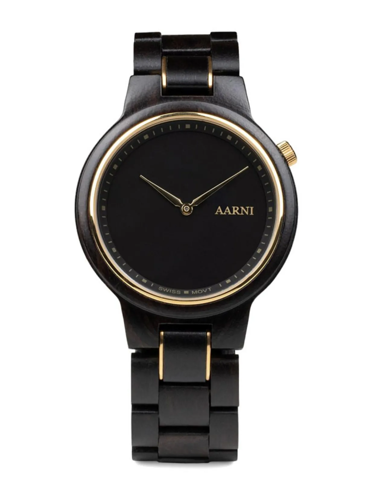 Mystiikkaa ja klassista kauneutta. Eebenpuusta valmistettu Aarni XO yhdistää pyöreän kellotaulun kultaisiin yksityiskohtiin. Upea kello lumoaa kantajansa ja kääntää katseet sekä miesten että naisten ranteissa. Kellon sydämenä toimii tarkka ja laadukas sveitsiläinen Ronda-koneisto.