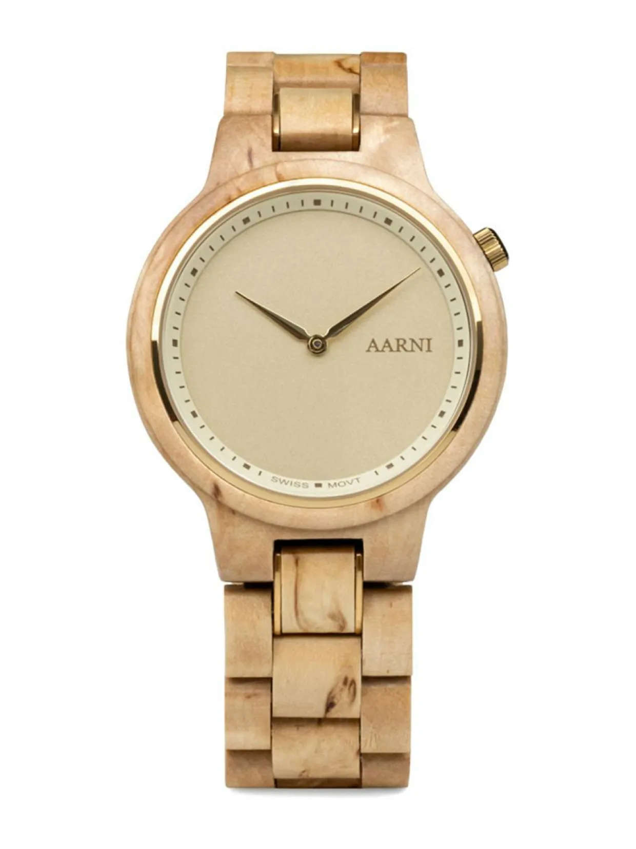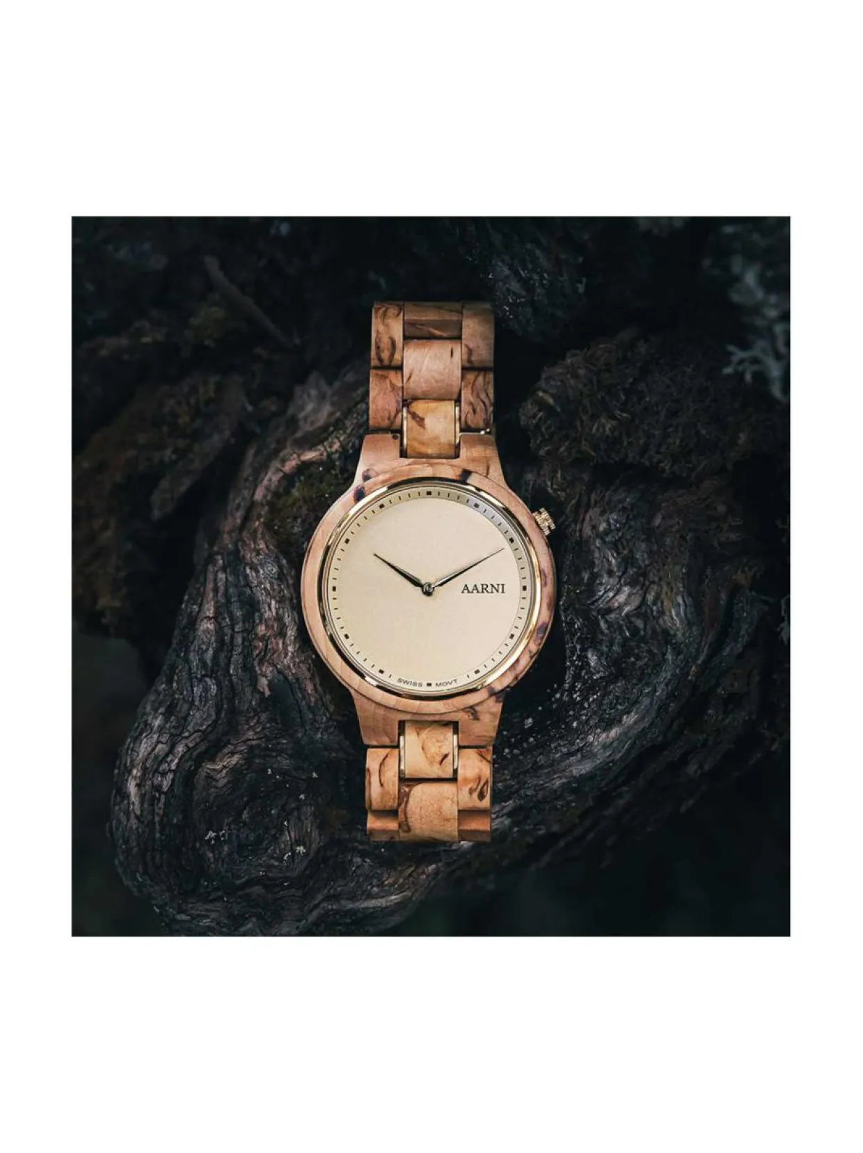 Suomalaisesta visakoivusta valmistettu Aarni XO on elegantti rannekello Sinulle, joka etsit ainutlaatuista kelloa. Kultaiset yksityiskohdat yhdistettynä ohueen koteloon tekevät tästä mallista todellisen katseenvangitsijan, joka sopii erinomaisesti sekä miesten että naisten ranteeseen. Kellon sydämenä toimii tarkka ja laadukas sveitsiläinen Ronda-koneisto.