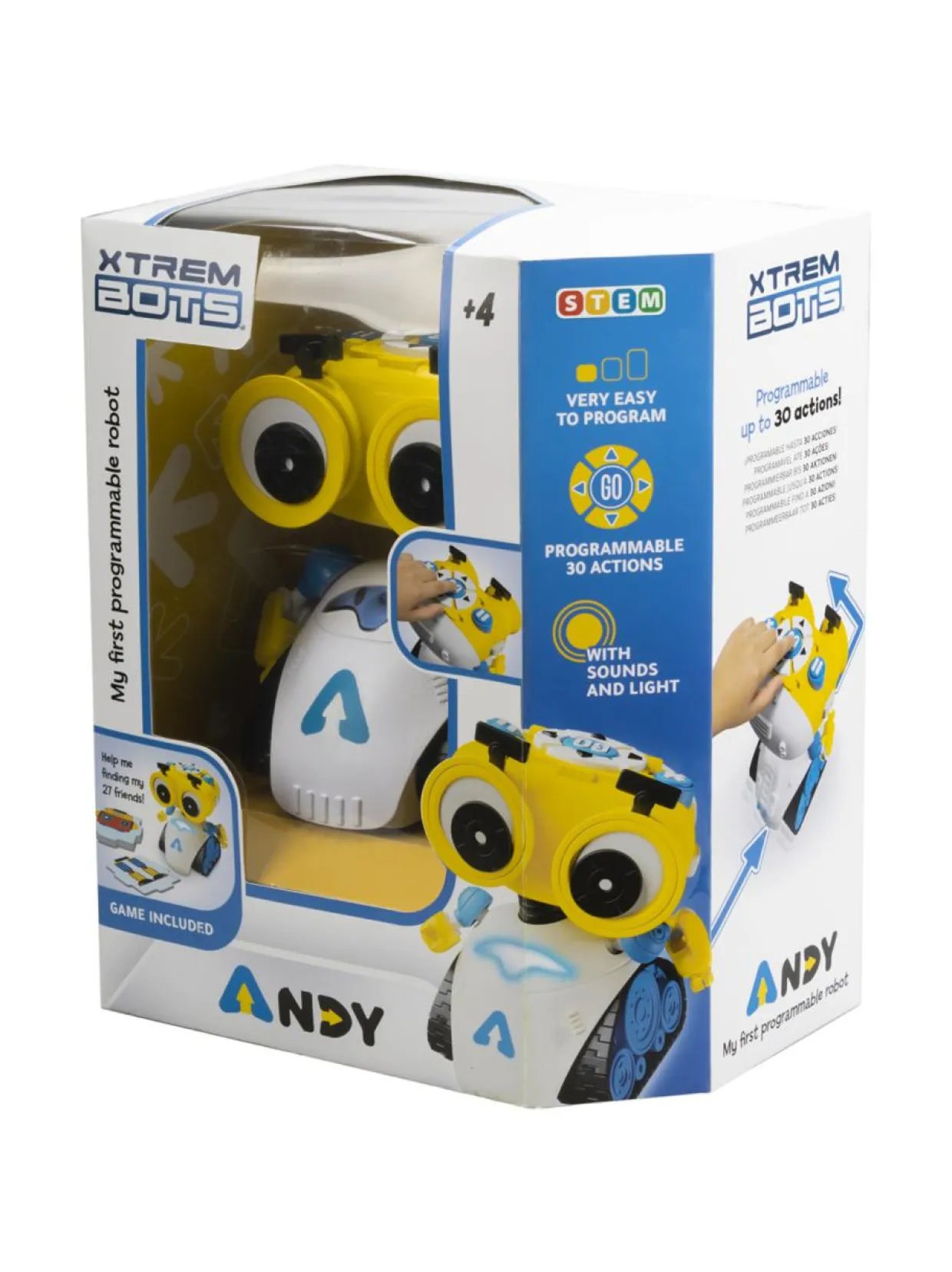 Andy, ensimmäinen ohjelmoitava robottini! Andy on ystävällinen robotti, jota on helppo oppia ohjelmoimaan. Nauti tanssimisesta Andyn kanssa sen melodioiden tahdissa! Mukana on myös peli, jossa voit löytää Andyn ystävät (9 korttia, joissa on robotin osia).