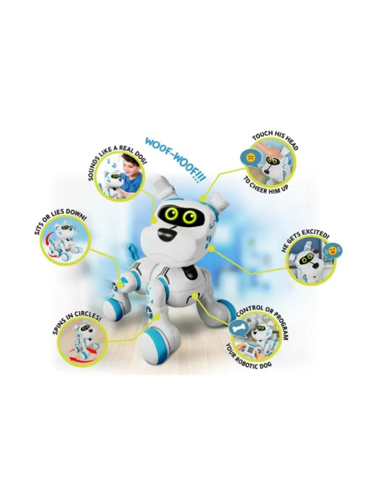 Paras lemmikkikaverisi! BOBBY on hulvaton, nelijalkainen ilopilleri! Pidä hauskaa, kun laitat sen istumaan, kävelemään ja jopa kerjäämään herkkuja. Mutta varo, jos laiminlyöt sitä, se haukkuu muistuttaakseen, että se kaipaa huomiotasi. Bobby odottaa komentojasi, halusitpa sitten ohjata sitä kauko-ohjaimella mihin suuntaan tahansa tai ohjelmoida jopa 40 toiminnon sarja. Muista vain antaa sille rakkautta! Ota Bobby mukaasi ja leiki sen kanssa kaikkialla!