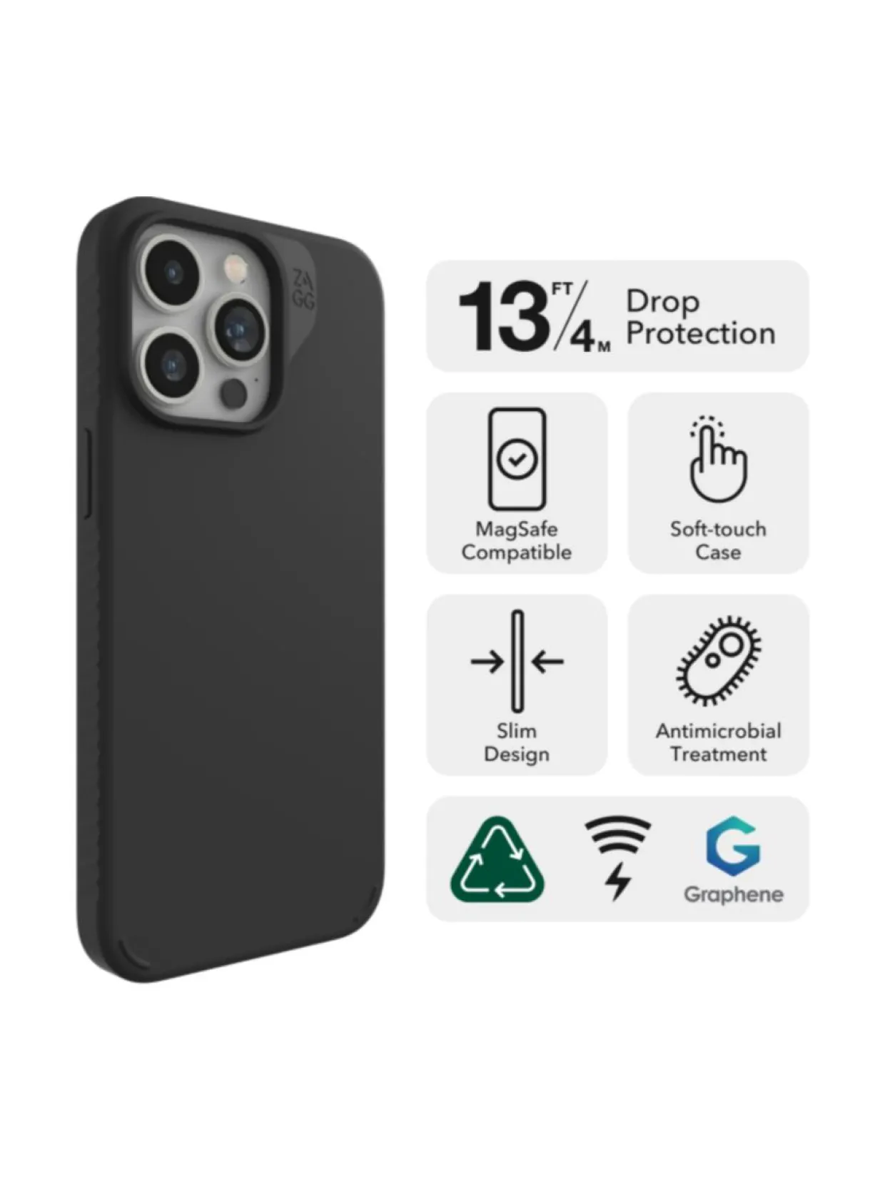 Zagg Manhattan Snap on MagSafe yhteensopiva suojakuori iPhonelle. Tyylikäs Manhattan Snap on valmistettu silikonista sekä vahvistettu grafeenilla, yhdellä maailman vahvimmista materiaaleista, jonka ansiosta se tarjoaa pudotussuojan jopa 4 metrin korkeudesta. Ohut muotoilu sekä aaltomainen otepinta takaavat mukavan käytön.